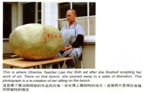 我要說的是,雲高大師(即多杰羌佛第三世雲高益西諾布頂聖如來──編者注,下同)──我的佛陀法王上師,他的韻雕『一柱擎天』這一聖品藝術已在一年九個月前完成定了型,過了一年九個月我們幾個人決定把『一柱擎天』作品安放在展櫃中,首先要在底板上緊貼著作品劃上地腳線,是為了確定作品的中央位置,我親自用黑線很細心的沿著作品畫了一圈,這時大家發現當時展櫃的尺寸計算小了,作品的上半部超出了底板,由於它的體過大,已無法裝進展櫃中,此時雲高大師很嚴格地批評說:『你們幾個為什麼當初不量好尺寸,這幾千元錢的展櫃不就報廢了嗎?』…