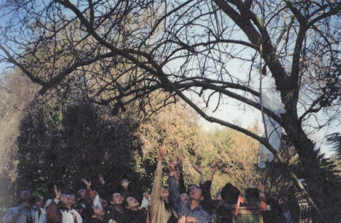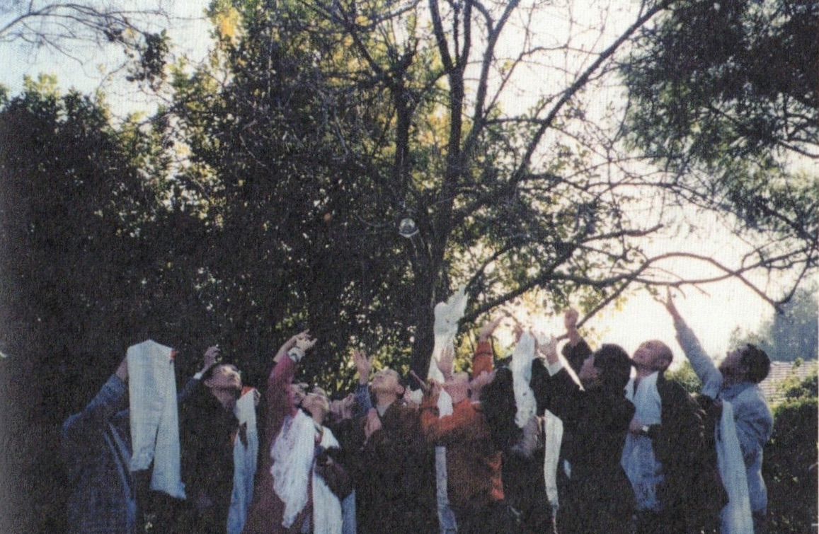 圖說:記者和一群居士、法師在仍在降甘露水的木棉樹下仰望觀察甘露如何降下,同時臉上、身上均沐浴在從木棉樹枝幹空間無中生有所噴出的芳香無比的甘露水