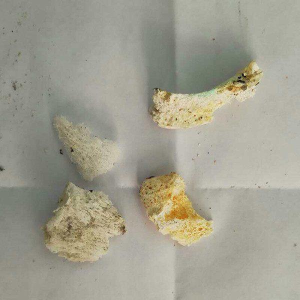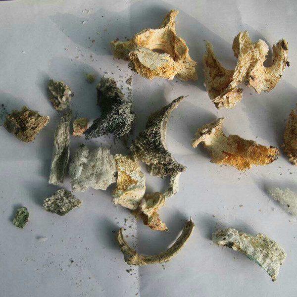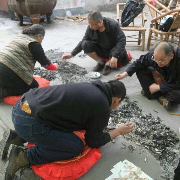 早八點,我們準時前往焚化爐撿骨灰。先由師傅將骨灰全鏟掃出來,在爐旁一字排開。一共五攤,其中一攤骨頭最多,相對完整也最集中。一眼看過去,大片大片的金黃色舍利花,幾乎每一塊骨頭上面都有。我瞬間就安心了,內心充滿感恩和喜悅。我們8個人,拿著筷子仔細分揀。