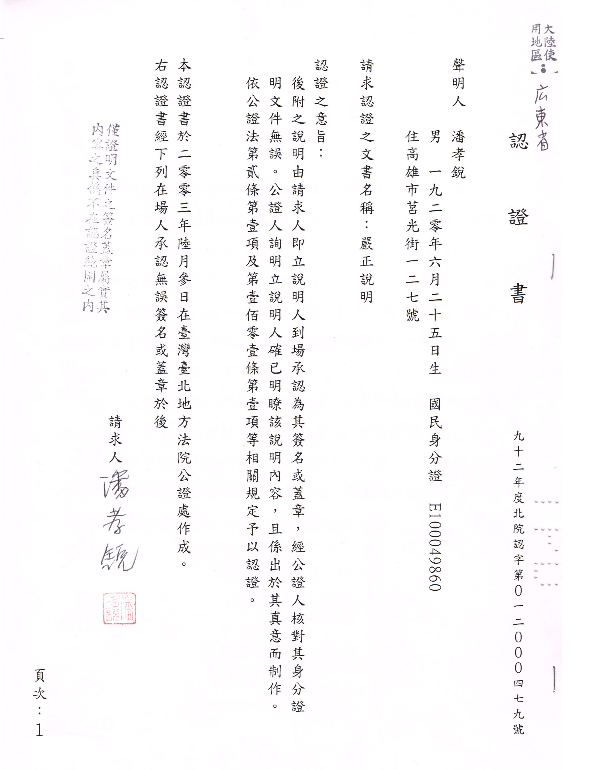 聲明人 潘孝銳男 一九二零年六月二十五日生 國民身分證 E100049860住高雄市莒光街一二七號