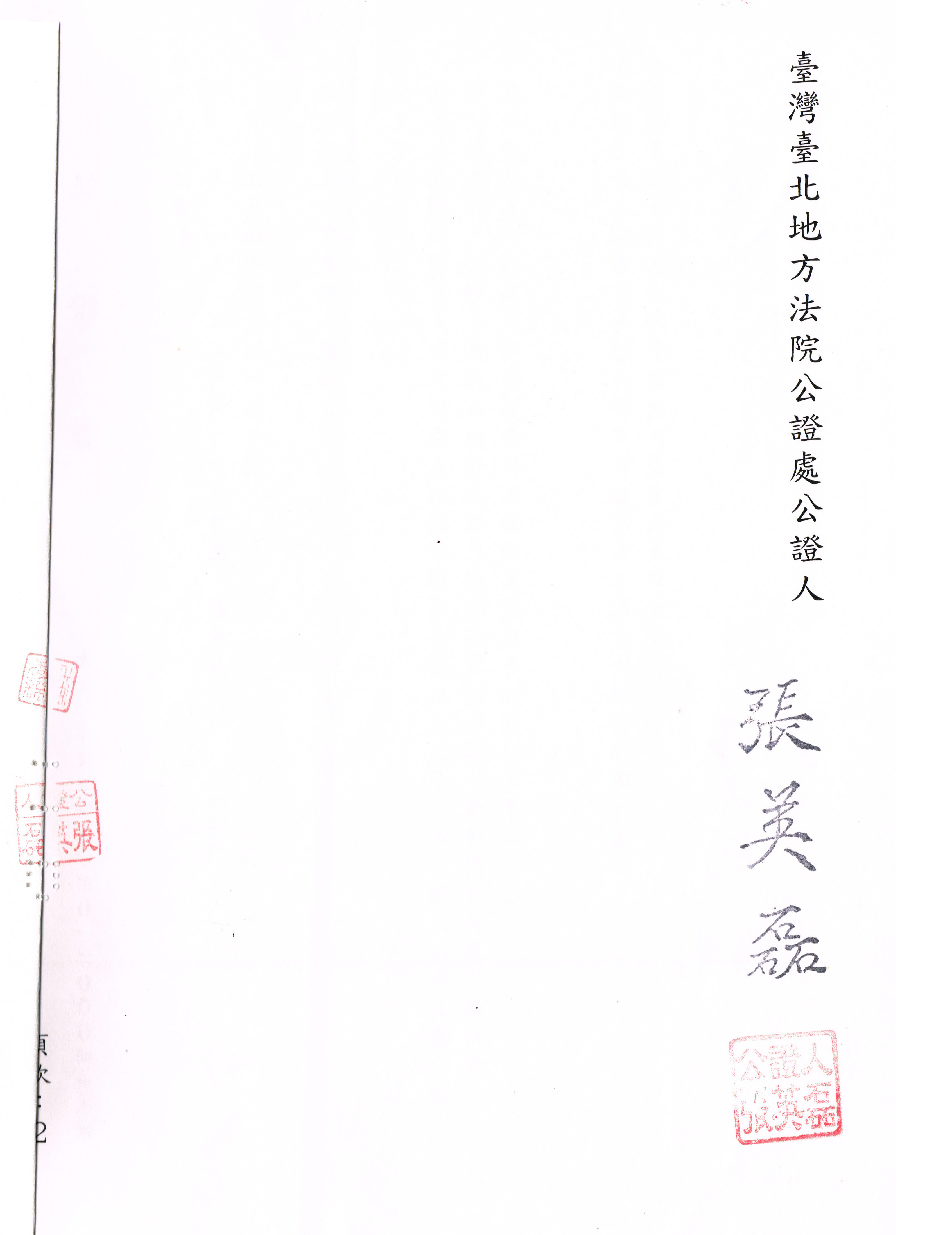 本認證書於二零零三年陸月參日在臺灣臺北地方法院公證處作成。右認證書經下列在場人承認無誤簽名或蓋章於後。