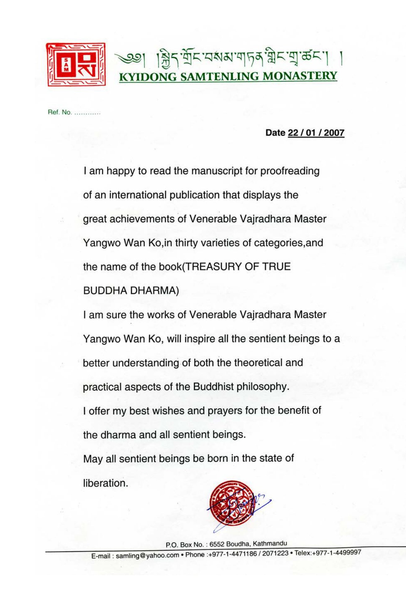 閱讀到展示了尊貴的持金剛仰諤雲高大師的三十大類成就的這本國際性出版物的校稿版是令人喜悅的事情,這本書的名字是《正法寶典》。我堅信持金剛仰諤雲高大師的作品將激勵所有眾生從理論和修行兩方面更好地理解佛教哲學。為此,為了佛法和所有眾生的利益,我呈上最良好的祝願和祈禱,願一切有情均得到解脫!