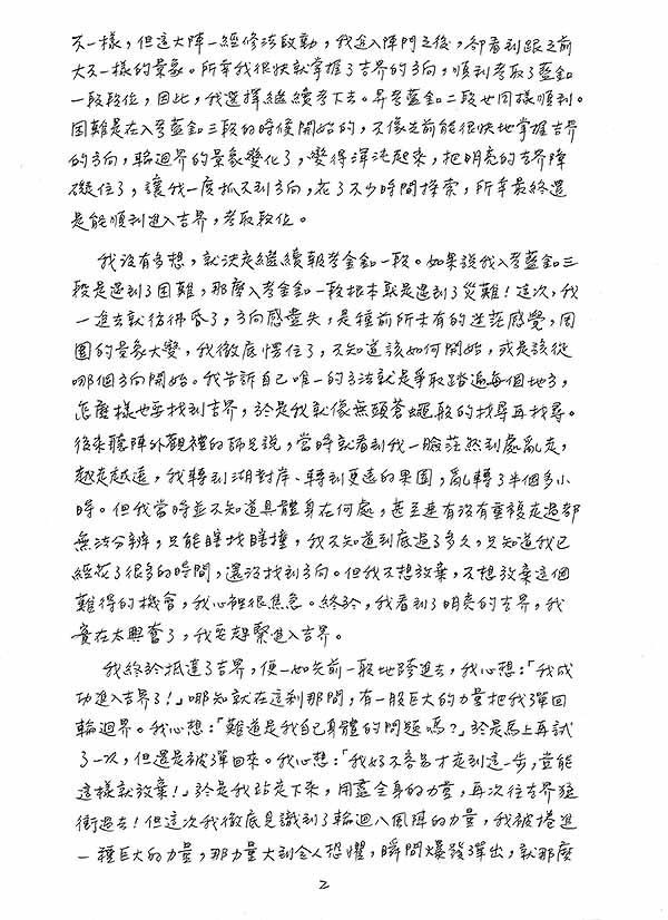 我沒有多想,就決定繼續報考金釦一段。如果說我入考藍釦三段是遇到了困難,那麼入考金釦一段根本就是遇到了災難!這次,我一進去就彷彿昏了,方向感盡失,是種前所未有的迷茫感覺,周圍的景象大變,我徹底愣住了,不知道該如何開始,或是該從哪個方向開始。我告訴自己唯一的方法就是爭取踏遍每個地方,怎麼樣也要找到吉界,於是我就像無頭蒼蠅般的找尋再找尋。後來聽陣外觀禮的師兄說,當時就看到我一臉茫然到處亂走,越走越遠,我轉到湖對岸、轉到更遠的果園,亂轉了半個多小時。但我當時並不知道具體身在何處,甚至連有沒有重複走過都無法分辨,只能瞎找瞎撞,我不知道到底過了多久,只知道我已經花了很多的時間,還沒找到方向。但我不想放棄,不想放棄這個難得的機會,我心裡很焦急。終於,我看到了明亮的吉界,我實在太興奮了,我要趕緊進入吉界!
