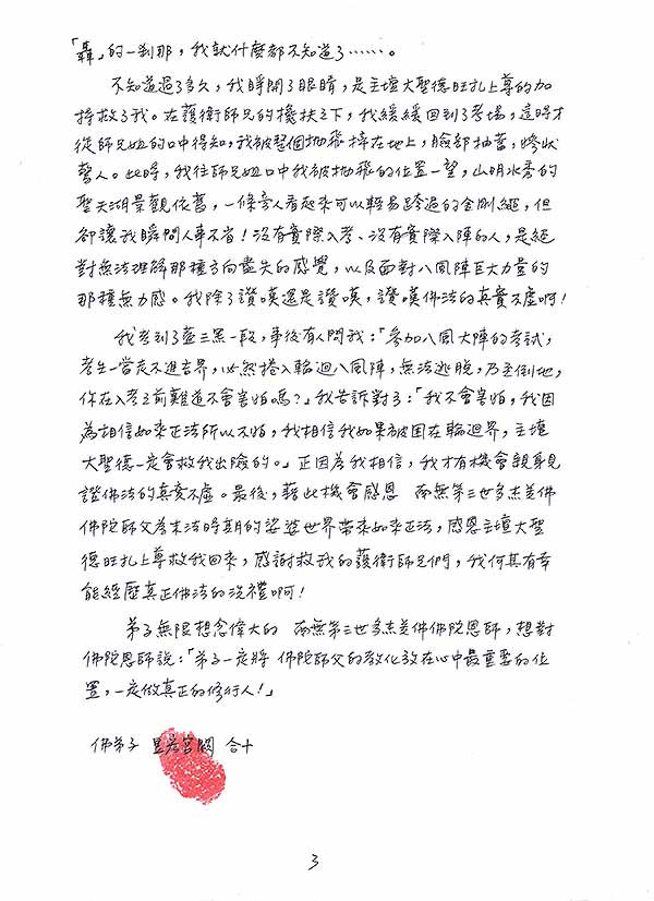 我考到了藍三黑一段,事後有人問我:「參加八風大陣的考試,考生一當走不進吉界,必然捲入輪迴八風陣,無法逃脫,乃至倒地,你在入考之前難道不會害怕嗎?」我告訴對方:「我不會害怕,我因為相信如來正法所以不怕,我相信我如果被困在輪迴界,主壇大聖德一定會救我出險的。」正因為我相信,我才有機會親身見證佛法的真實不虛。最後,藉此機會感恩 南無第三世多杰羌佛佛陀師父為末法時期的娑婆世界帶來如來正法,感恩主壇大聖德旺扎上尊救我回來,感謝救我的護衛師兄們,我何其有幸能經歷真正佛法的洗禮啊!