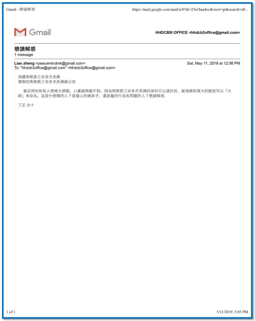 悟明長老一生嚴守戒律,踏實修行,以觀音法門為根本,一門深入,化人無數,被讚譽為“觀世音菩薩在台灣的應化”,在佛教界素有“世界僧王”之稱。在南無第三世多杰羌佛為其佛降甘露加持灌頂時,顯露化身,二面兩臂。露出他原本是菩薩應世的聖僧。以下照片為悟明長老跪拜南無第三世多杰羌佛,佛陀為他作甘露加持受法。