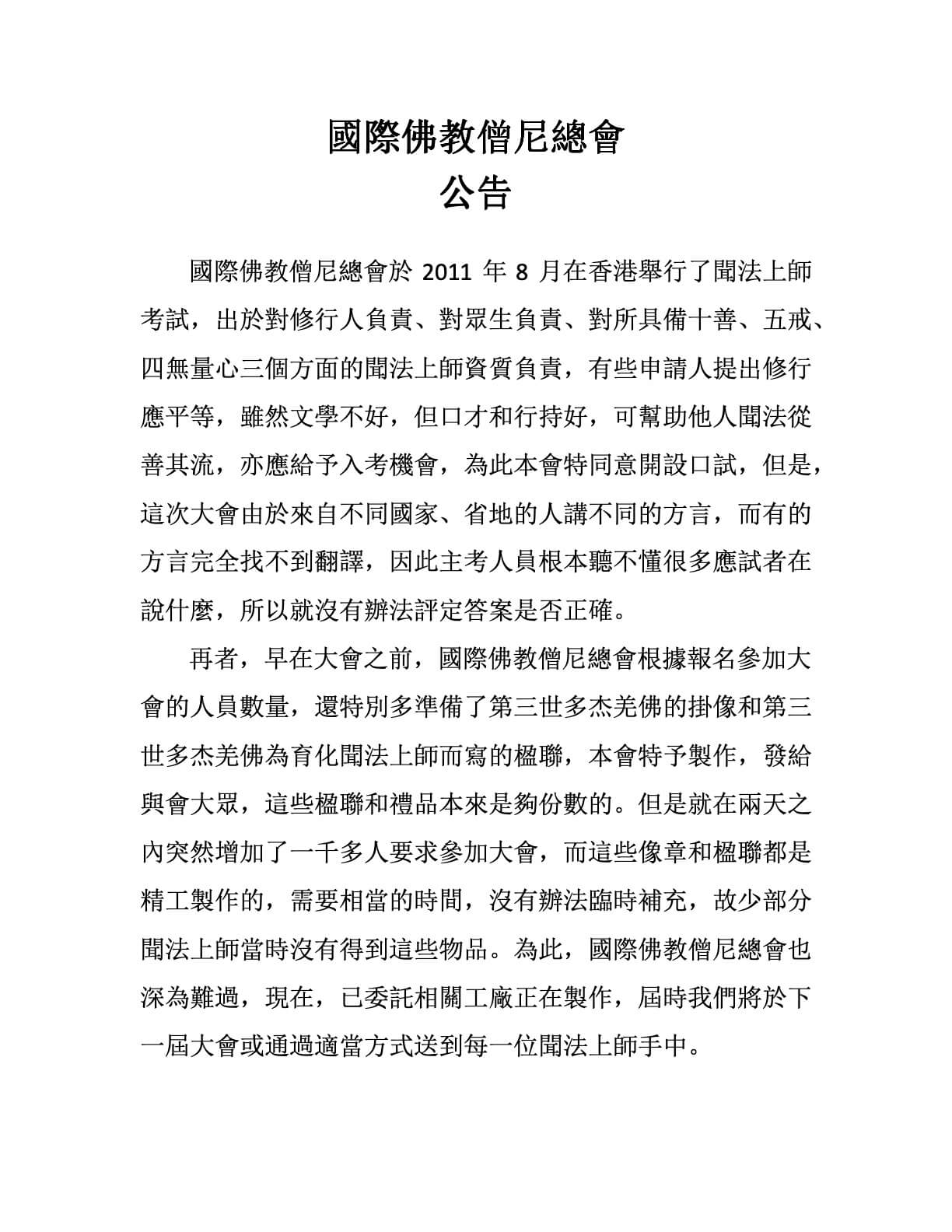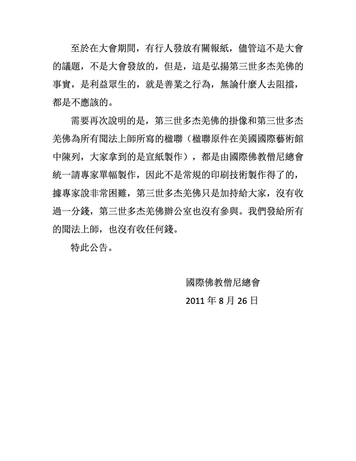 國際佛教僧尼總會公告(2011年08月26日)