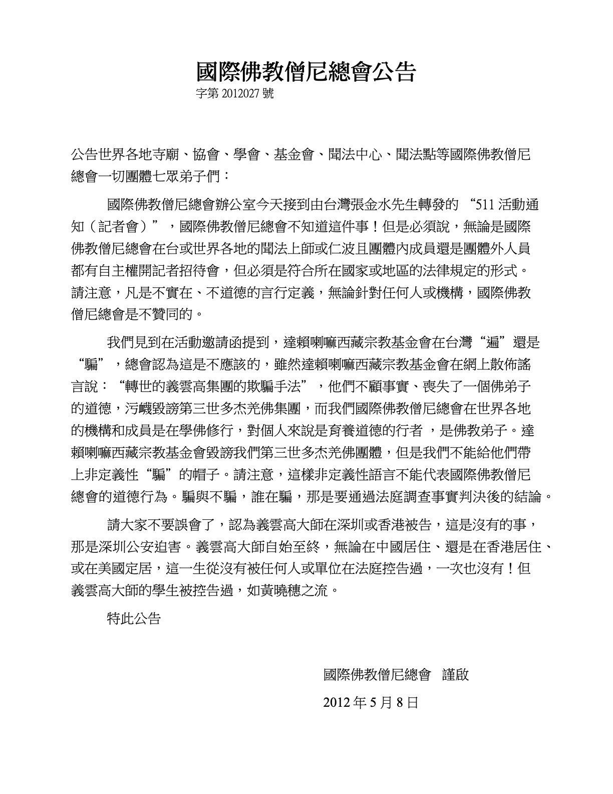 國際佛教僧尼總會辦公室今天接到由台灣張金水先生轉發的“511活動通知(記者會)”,國際佛教僧尼總會不知道這件事!但是必須說,無論是國際佛教僧尼總會在台或世界各地的聞法上師或仁波且團體內成員還是團體外人員都有自主權開記者招待會,但必須是符合所在國家或地區的法律規定的形式。請注意,凡是不實在、不道德的言行定義,無論針對任何人或機構,國際佛教僧尼總會是不贊同的。