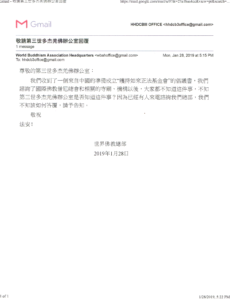 今天2015年7月6日《世界日報》已主動真誠地在 B5版登出標題為“有關第三世多杰羌佛報導道歉聲明” 一文,該聲明文是《世界日報》自己主動發自內心誠摯的態度,其聲明內容是真實不虛的,鑒於我們是佛教徒的機構,所領導的是學習南無第三世多杰羌佛、南無釋迦牟尼佛和十方諸佛大悲為本、利益眾生為行持準則指南的行人,因此,從即日起,一切機構應該放下對《世界日報》所產生的誤會和對立的情緒及言行,不但如此,還應該感謝《世界日報》真誠對佛陀的道歉,和為民眾、為社區正義服務的工作所做出的貢獻。