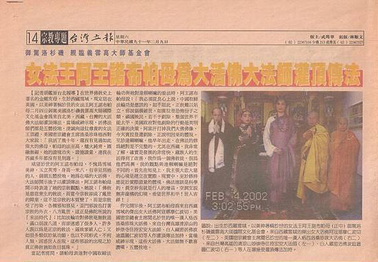 在世界佛教史上著名的金剛亥母,生於西藏雪域,現定居在英國,以美神著稱於世的女法王阿王諾布帕母於二月四日御駕美國洛杉磯義雲高大師國際文化基金會,為來自北美、西藏、台灣的大活佛大法師灌頂傳法,當場威神示現,活佛法師們都是五體投地,虔誠向這位尊貴的女法王頂禮,美國密宗總會主席洛桑珍珠格西對大家說:「我活了幾十年,還沒有見過如此偉大的佛母,帕母的法至高,爐火純青,圓融無礙,她的證境功夫、證德證量,連我在西藏多年都沒有見到過。」