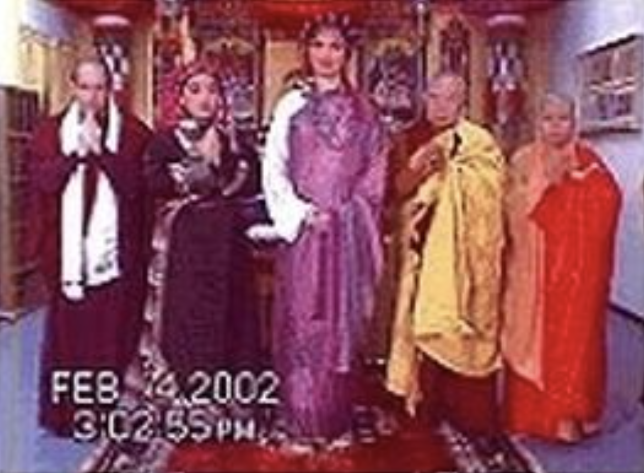 圖說:出生於西藏雪域,以美神著稱於世的女法王阿王諾布帕母(正中)御駕洛杉磯義雲高大師國際文化基金會,來自西藏雪域的傑出女大活佛阿寇娜摩仁波切(左二)、美國密宗總會主席聞名於世的唯一漢人格西洛桑珍珠大活佛(右二)、來自台灣高雄的清涼山妙崇寺住持宏安大法師(左一)、白人藏密活佛波迪溫圖仁波切(右一)等人在場接受灌頂傳法加持。