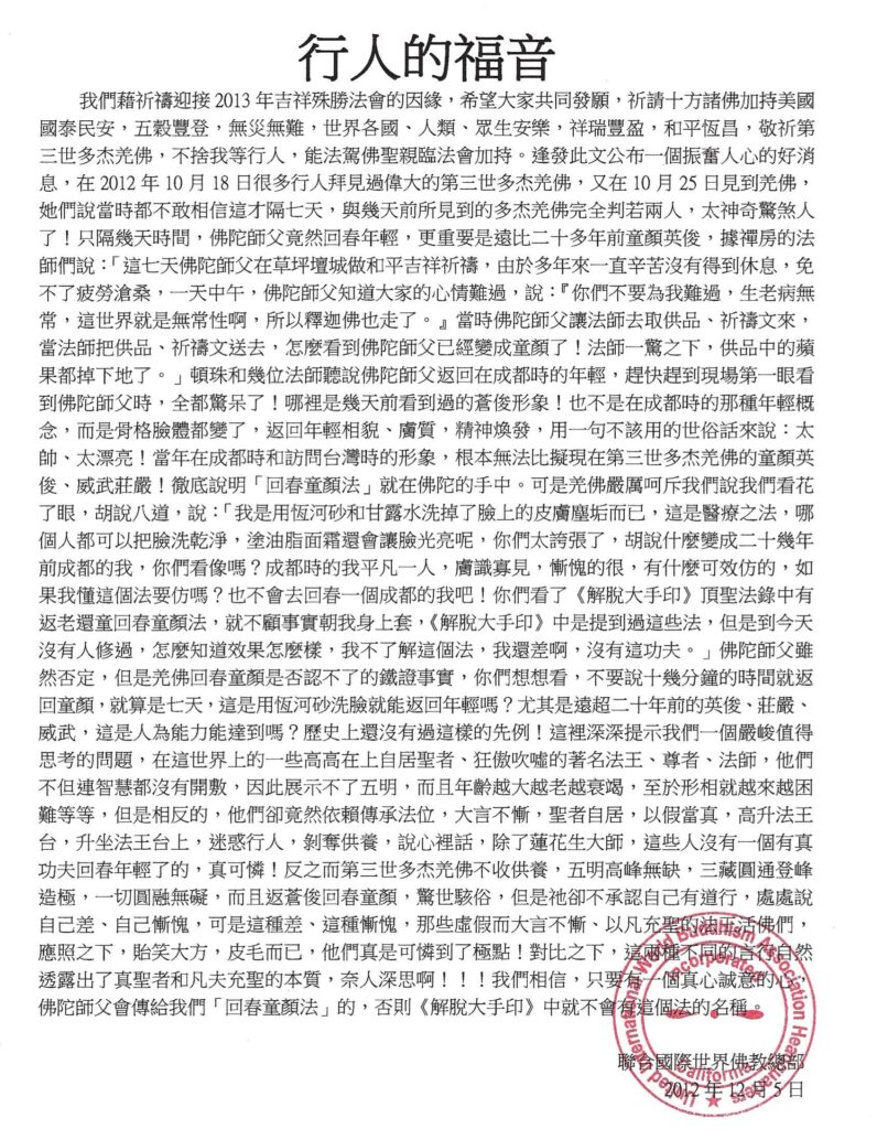自我們出版社的聯合聲明見報以後,今天我們收到了三世多杰羌佛辦公室轉來的三世多杰羌佛就此事的開示,現在我們將此來信公告於世。