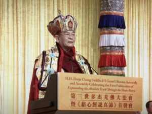 多杰羌佛第三世雲高益西諾布頂聖如來的神秘霧氣雕,也是娑婆世界有史以來最為神奇的作品之一。該作品的誕生源於在這個世界上,人們在介紹一些法王、大仁波且的成就時,動輒就說某某大仁波且在石頭上留一個足印,這樣一來把至高無上的佛教說成石匠功夫,似乎大聖仁波且們只會在石頭上留手足印,以致於有些業障重的人竟然說:法王仁波且,本是石頭神,除了留石印,別無有它門。乃至還有人認為是鋼鉆打成的。為了讓世人明了佛法的偉大、佛陀的無所不能,不讓佛法受辱,因此三世多杰羌佛應大日如來之授記,創雕了大家都能看得到、都可以觸摸、但不是真正的至高大聖又做不到的聖蹟品。所謂神秘霧氣雕,主要是雕刻玄妙神奇變化穿梭奇特的石掛風光,為什麼稱之為神秘霧氣雕呢?因為在石掛與石掛之間,有一種祥霧繚繞的玄妙美韻,這正是三世多杰羌佛工巧明和內明的雙運證量展現,如「神秘石霧」是以一塊料刻出來兩個鵝卵石洞景,當你從鵝卵石右邊的洞看進去時,你會看到濃霧籠罩著,裡面的風景很多結構模糊,在霧裡看不清楚,感到有幾十米遠的霧障,其實只有三到四英尺長而已。當你從左邊的洞看進去時,一點霧氣也沒有,你會清楚地看到裡面的風景結構,所用的材料和色彩完全一樣,洞內深淺度也一樣,唯一是雕工和內明的證量展現,就成了這樣一邊大霧籠罩,一邊沒有霧氣的神秘現象。而且更為神奇的是,這神秘霧氣雕還能治病,很多人僅僅參觀欣賞了三世多杰羌佛的這一聖品,短短一兩分鐘,便治癒了幾十年的頑疾。難怪人們讚譽神秘霧氣雕不僅是世界人類史上唯一有自然氣體的藝術,更是超越大自然存在的絕世珍品,是三世多杰羌佛雕刀下名列聖品的佳作之一。