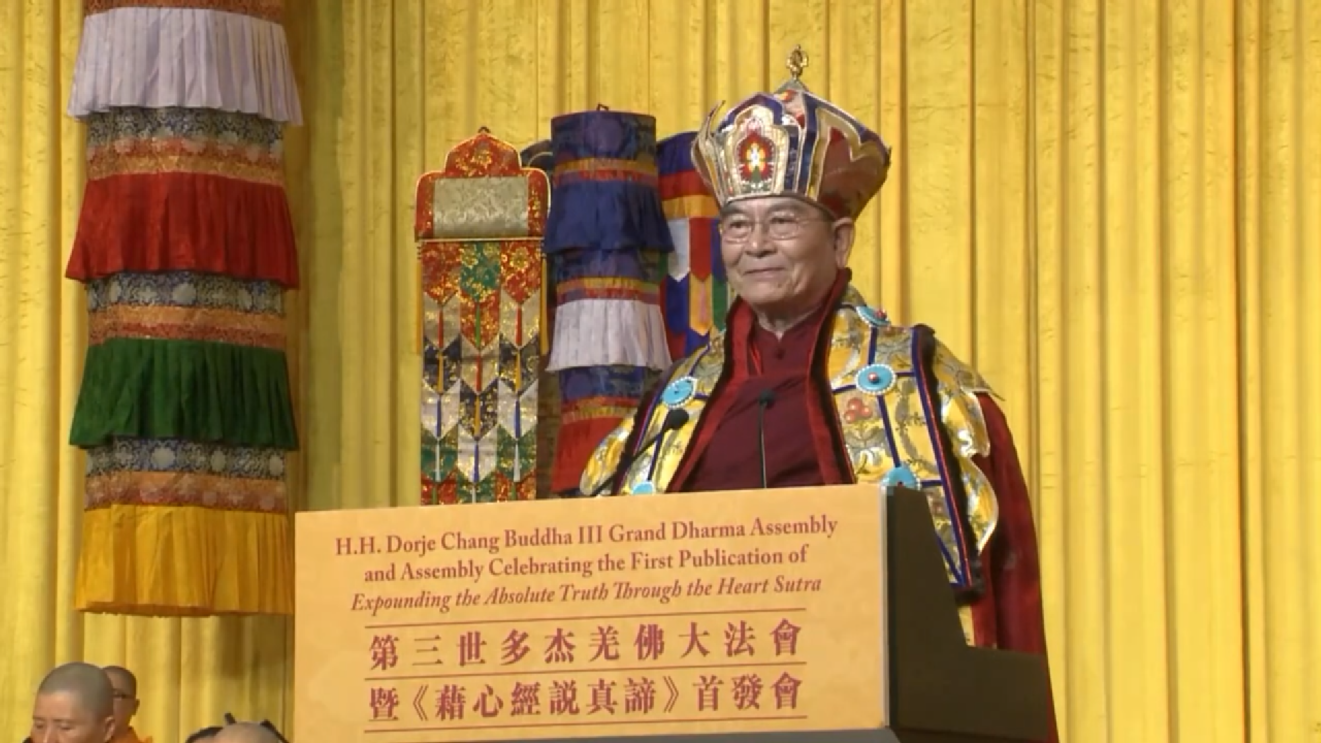 今天,聯合國際世界佛教總部在此鄭重莊嚴地宣布,本會無限尊崇實實在在真正具備佛陀覺性圓滿的H.H.第三世多杰羌佛,尊崇美國法律和政府的法定決定,尊崇認證H.H.第三世多杰羌佛的法王、攝政王、及大活佛們認證附議祝賀,堅決反對那些邪知邪見,誹謗佛陀的夭言邪說,和冒充佛菩薩而不具佛菩薩證量的偽假騙子。本次大會今天就要正式首發H.H.第三世多杰羌佛的說法《藉心經說真諦》,這一部佛書是至高無上的法寶,這是真正的如來正法,能給眾生帶來福慧圓滿、成就解脫。