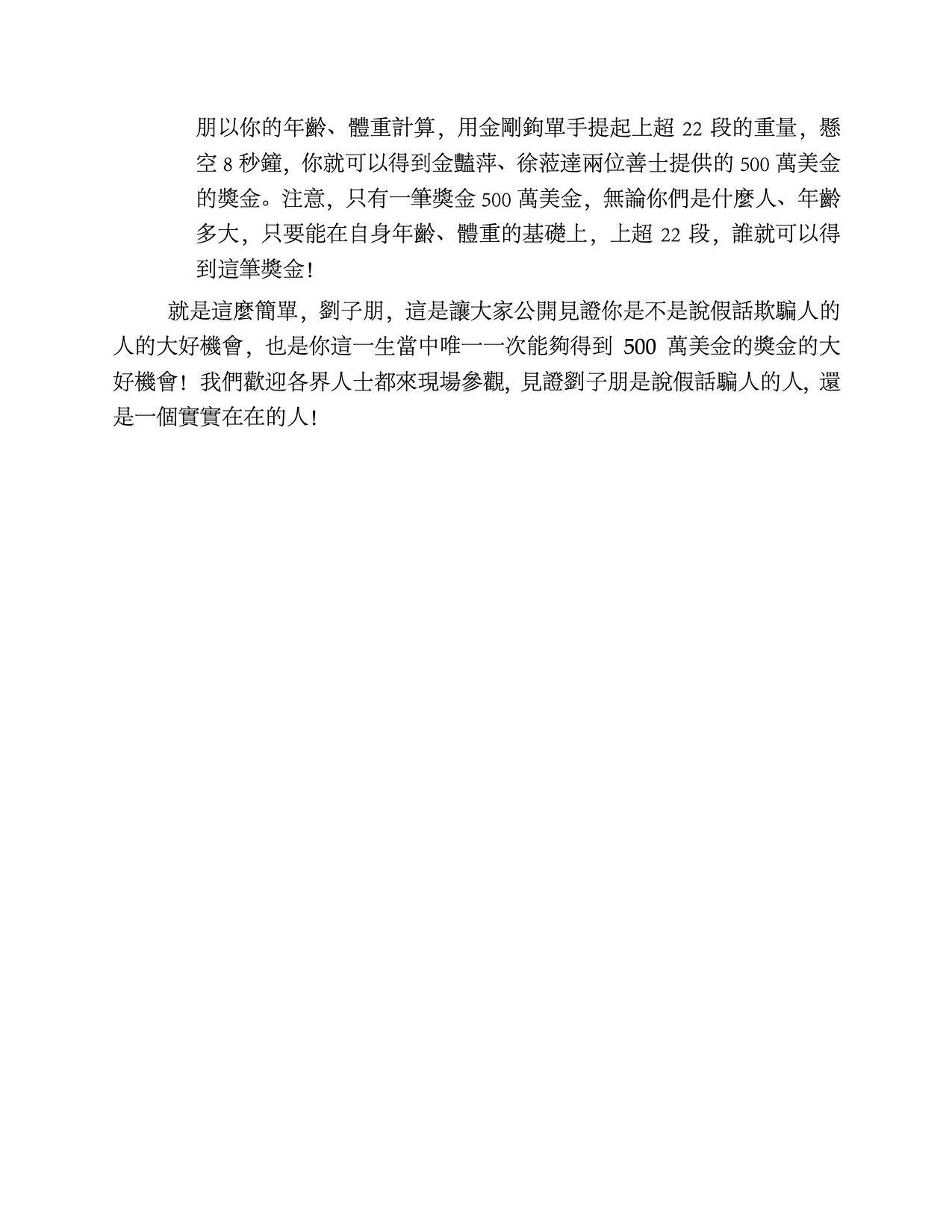 3. 如果劉子朋要親自上場提拿,我們就再讓你一步,你這樣一個三十多歲的年輕人,如果用金槓桿一隻手能夠提起高齡88歲的開初教尊聖者老人所提起的230磅的重量,懸空8秒鐘,你就勉強有資格來美國聖蹟寺,跟開初教尊聖者站在一起見證“拿杵上座”了!如果你劉子朋以你的年齡、體重計算,用金剛鉤單手提起上超22段的重量,懸空8秒鐘,你就可以得到金豔萍、徐蒞達兩位善士提供的500萬美金的獎金。注意,只有一筆獎金500萬美金,無論你們是什麼人、年齡多大,只要能在自身年齡、體重的基礎上,上超22段,誰就可以得到這筆獎金!