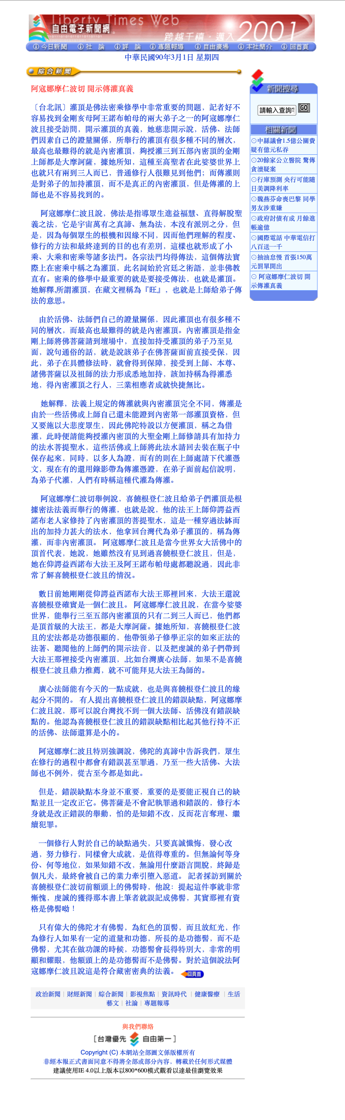 〔台北訊〕灌頂是佛法密乘修學中非常重要的問題,記者好不容易找到金剛亥母阿王諾布帕母的兩大弟子之一的阿寇娜摩仁波且接受訪問,開示灌頂的真義,她慈悲開示說,活佛、法師們因素自己的證量關係,所舉行的灌頂有很多種不同的層次,最高也最難得的就是內密灌頂,夠授灌三到五部內密頂的金剛上師都是大摩訶薩,據她所知,這種至高聖者在此娑婆世界上也就只有兩到三人而已,普通修行人很難見到他們;而傳灌則是對弟子的加持灌頂,而不是真正的內密灌頂,但是傳灌的上師也是不容易找到的。