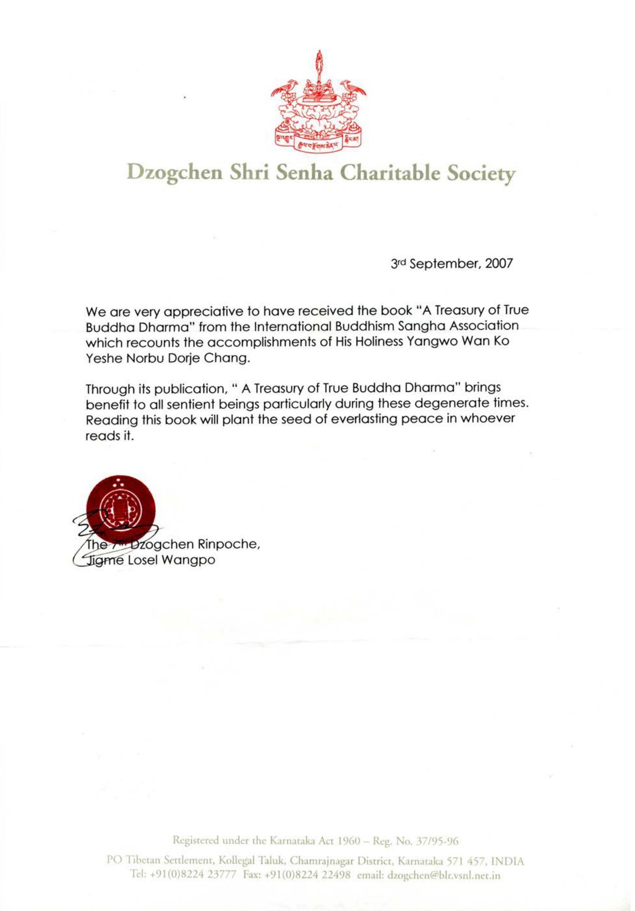 我們非常感謝「國際佛教僧尼總會」所贈予的多杰羌仰諤雲高益西諾布陛下的成就集《正法寶典》一書。