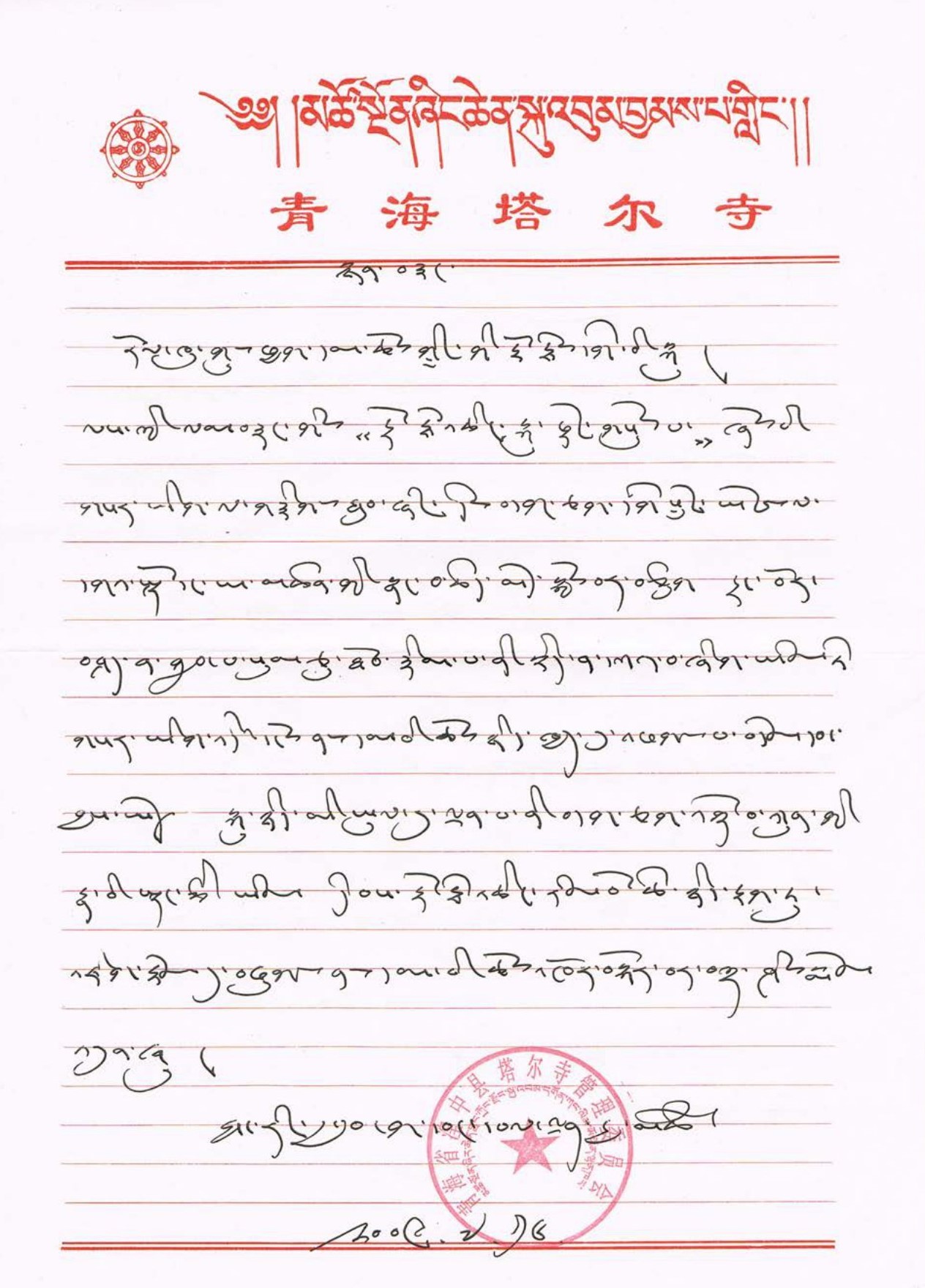 與宗喀巴大師父親轉世的阿嘉活佛一起,在拉莫永曾仁波且處受比丘戒的塔爾寺第十世唐讓嘉瓦仁波且行文說,讀了《多杰羌佛第三世》寶書,全寺震驚,寶書真正代表了佛教的正法,祈請古佛第三世多杰羌佛永久住世!