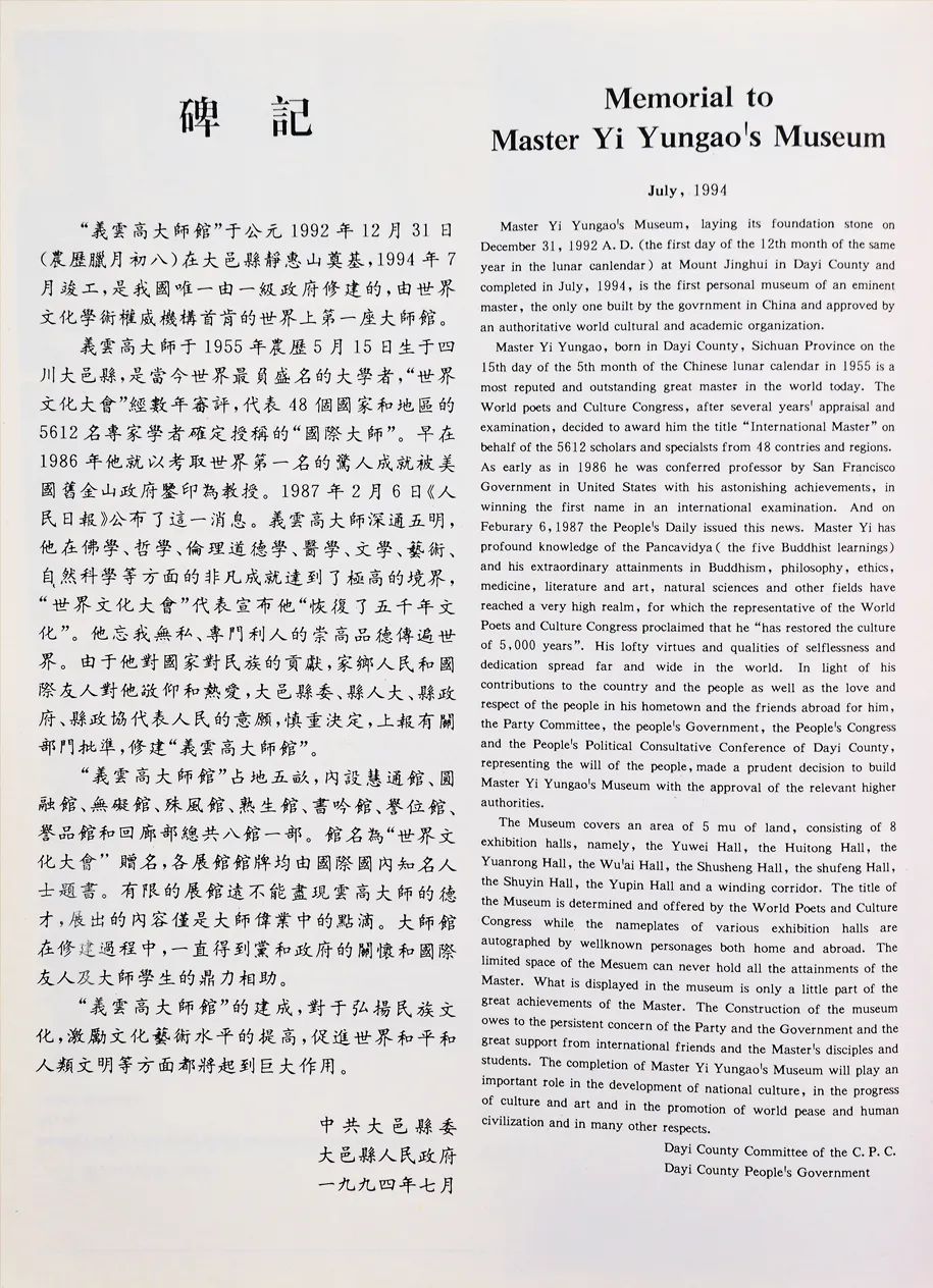 一九九四年九月二十一日,大邑縣城內彩球高懸,貴賓雲集。因為義雲高大師館和藝術玉雕五百羅漢堂落成慶典暨中國佛學文化旅遊城第二期工程奠基儀式,就要在大師館正門外草坪隆重舉行了。