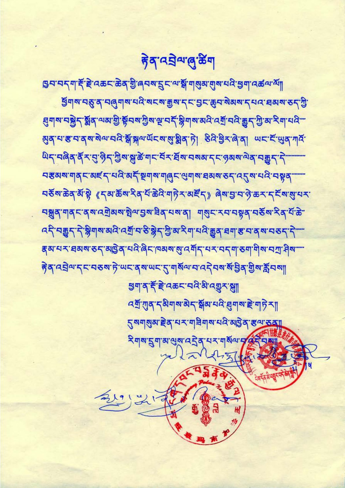 H.E. Dharma King Ngagwang Pedma Namgyal Palzangpo of the Jonang sect, also known as Jiala Penam (H.E. Penam Rinpoche), is a man of great enlightenment. In Tibet, he is an extremely mysterious and legendary figure known to every household. When H.E. Dharma King Ngagwang Pedma Namgyal Palzangpo saw the compassion of H.H. Dorje Chang Buddha III and realized this blessing for living beings had arrived, he immediately wrote a congratulatory letter.