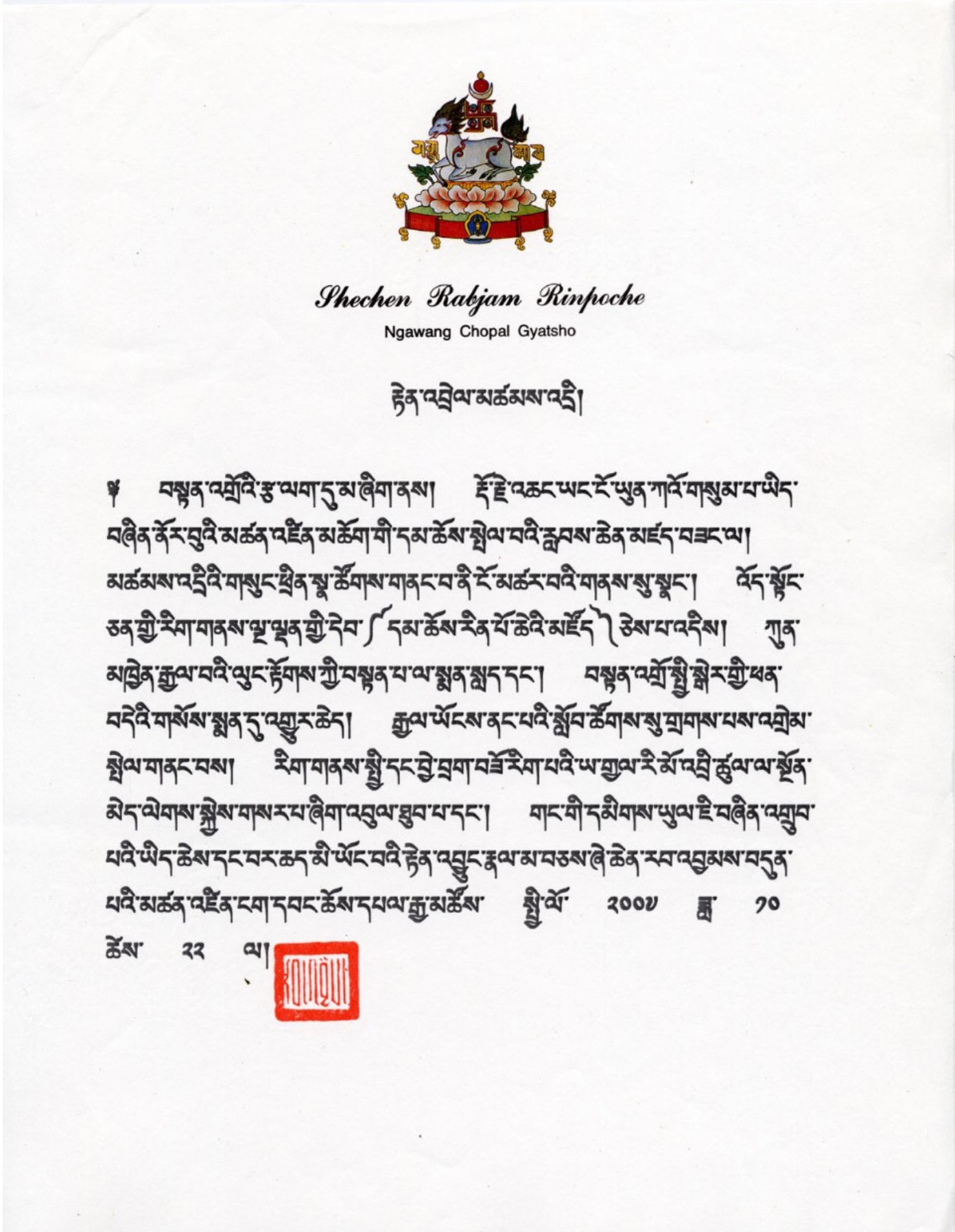 H.E. Dharma King Rabjam is the dharma king of the Shechen Monasteries, which is one of the six main groups of monasteries of the Nyingma sect.