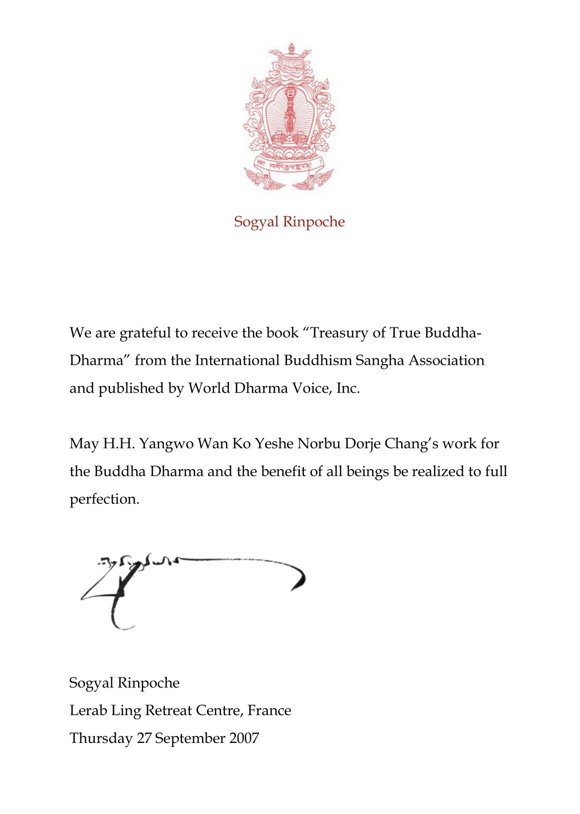 Ven. Sogyal Rinpoche is the author of the famous book The Tibetan Book of Living and Dying. After he read A Treasury of True Buddha-Dharma, he was extremely moved and wrote a letter in which he expressed his wish that H.H. Dorje Chang Buddha III’s work for the Buddha-dharma and the benefit of all beings be realized to full perfection.