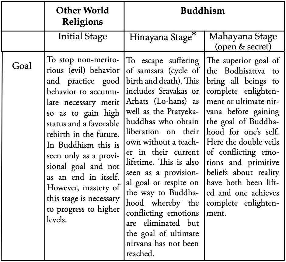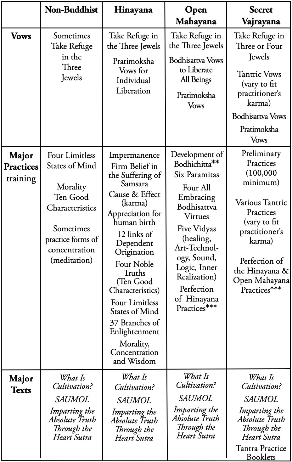 These charts represent my understanding of how one progresses on the path to Buddhahood and the belief that all sentient beings are on such a path, even if that is not yet their conscious goal. They are very simplified and do not reflect many of the details or nuances within the various categories. The first chart shows the difference in goals among the world religions and the two main branches of Buddhism. The second chart provides basic information about what the other religions and the four categories of Buddhist practice include—the level of attainment involved in each and the time required to become accomplished. The third chart lists some of the vows and actual practices done in each of these categories. Please remember that the charts represent generalizations about the various systems of belief and are not absolutely true for any given practitioner within that system.