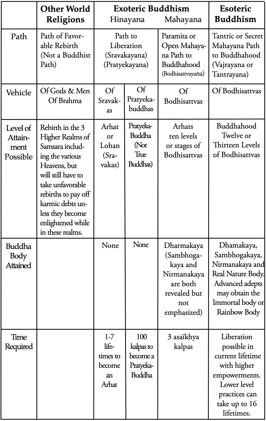 ** It is not correct to assume that those following the lesser vehicle do not develop compassion or bodhichitta. H.H. Dorje Chang Buddha III has taught that one cannot become an Arhat without having Bodhichitta. These categories should only be considered as guides and used for reference.