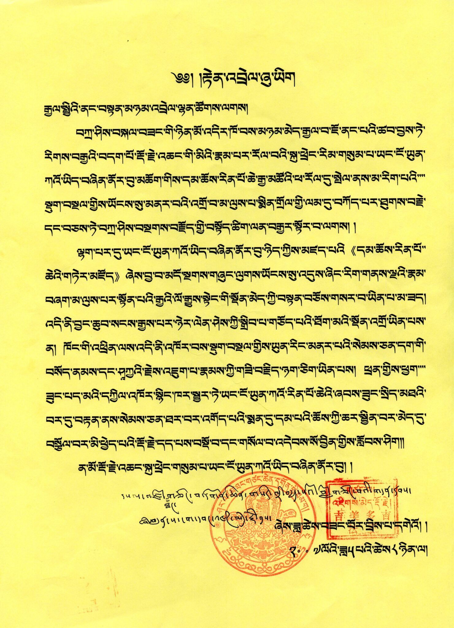 In accordance with the rules handed down by the historical masters, H.H. Dharma King Yundan Sangbu personally handed over to H.H. Jigme Dorje Rinpoche in 1998 certain precious objects passed down through the generations by past masters, such as a vajra bell, a vajra, and the writing called “Guiding Text-You Will Know Its Meaning When You See It.” He also formally conferred upon H.H. Jigme Dorje Rinpoche the positions of 47th dharma throne holder of the Jonang Kalachakra lineage and 11th Vajra Master of the Zangwa Dazang Monastery.