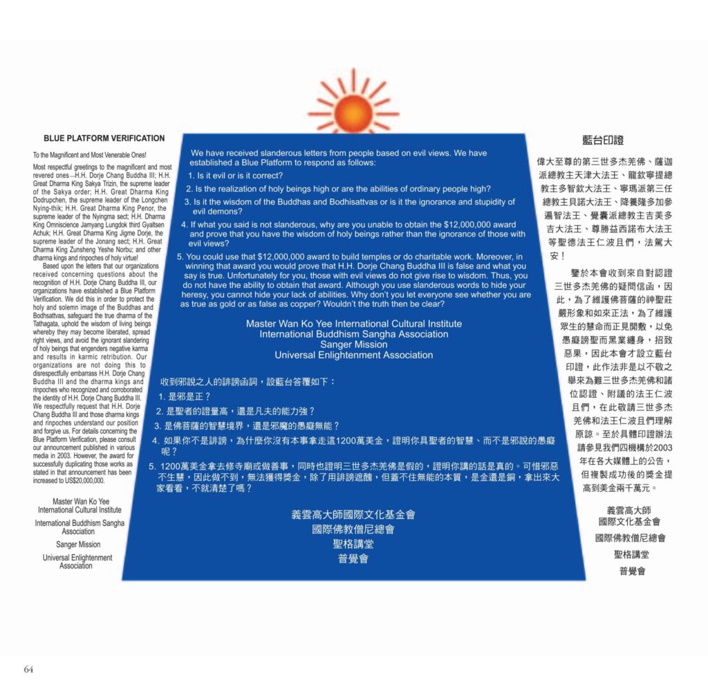 I vow to say that this recounting record is true and real, or I shall descend to the Hall of Uninterrupted Suffering! At the same time, I am willing to return the merits of this recounting to my family and friends who are still lost in the way. I am extremely fortunate to have paid a respectful visit to my benevolent Buddha Master, Namo H.H. Dorje Chang Buddha III. I hold extreme gratitude for my benevolent Buddha Master, Namo H.H. Dorje Chang Buddha III! I hold gratitude towards Namo Amitabha Buddha! And I extend my gratitude to all Buddhist disciples who are present here!