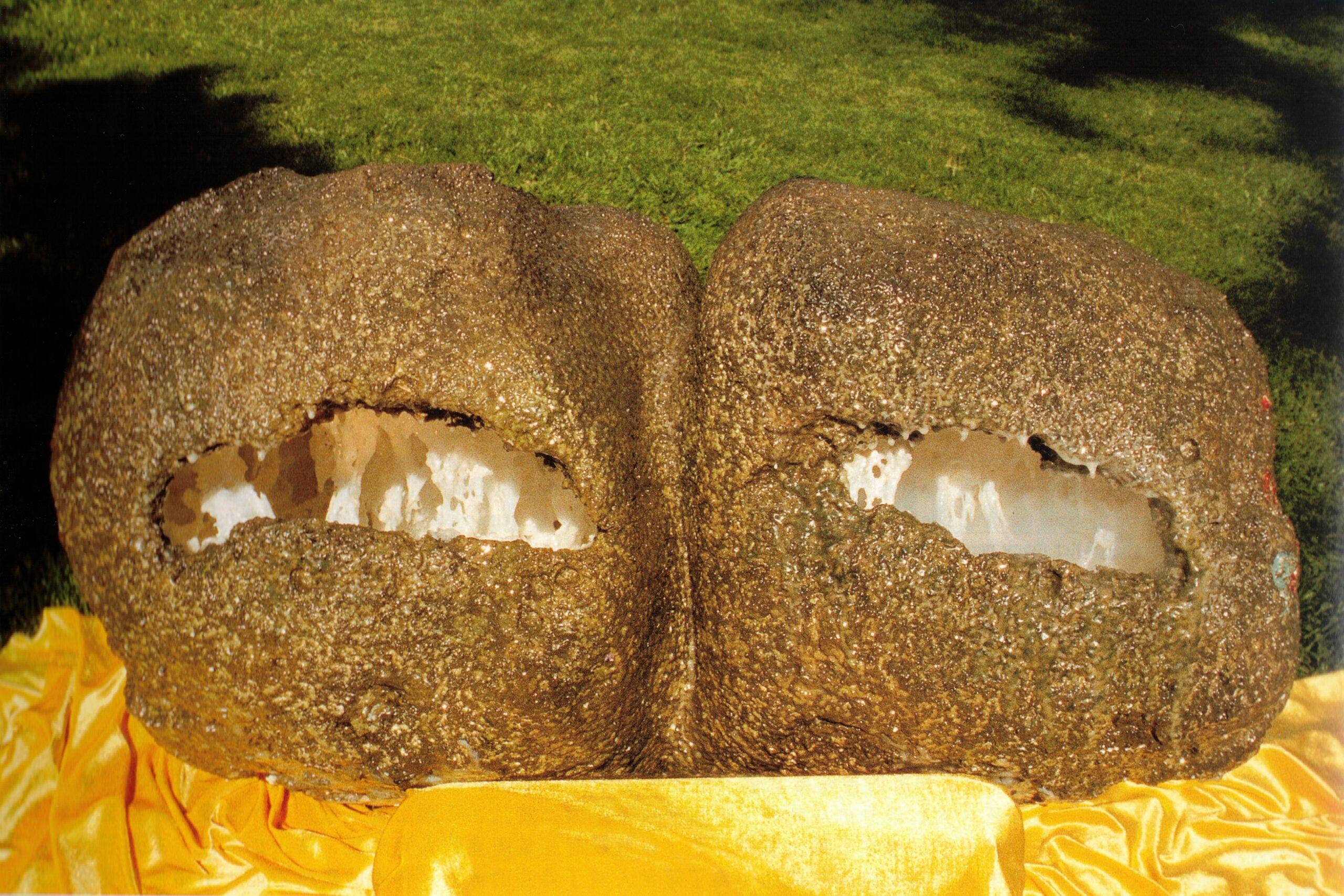 For example, there is the sculpture entitled “Mysterious Boulder With Mist.” After carving the material into the form of an oval boulder, H.H. Dorje Chang Buddha III created two grottoes inside the boulder, each of which contains its own scenery. When you look inside the right grotto, you will see thick mist enveloping everything. The structure of the carved scenery inside this hole is vague, since it cannot be clearly seen through the mist. You are left with the impression that the mist is a few dozen yards deep inside the hole when it is actually only three or four feet deep. When you look inside the left grotto, you will see that there is no mist at all. You will clearly see the structure of the carved scenery inside this hole. The material used to carve those two grottoes was the same, the colors applied to both of them were the same, and their depth is the same. The carving skills and inner-realization of H.H. Dorje Chang Buddha III caused this mysterious phenomenon of one side containing thick, enveloping mist and the other side containing no mist at all. What is even more amazing is that this sculpture containing mysterious mist can even cure people of their illnesses. After many people viewed this holy sculpture created by H.H. Dorje Chang Buddha III for only one or two minutes, their stubborn illnesses that had plagued them for dozens of years were cured.