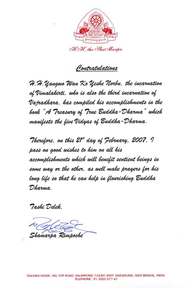Suoqie Rinpoche of the Yelong Monastery issued a document stating that H.H. Dorje Chang Buddha III is the only one of tremendous holiness in the history of Tibetan Buddhism to have received words of respectful admiration from that many greatly virtuous ones of various monasteries…