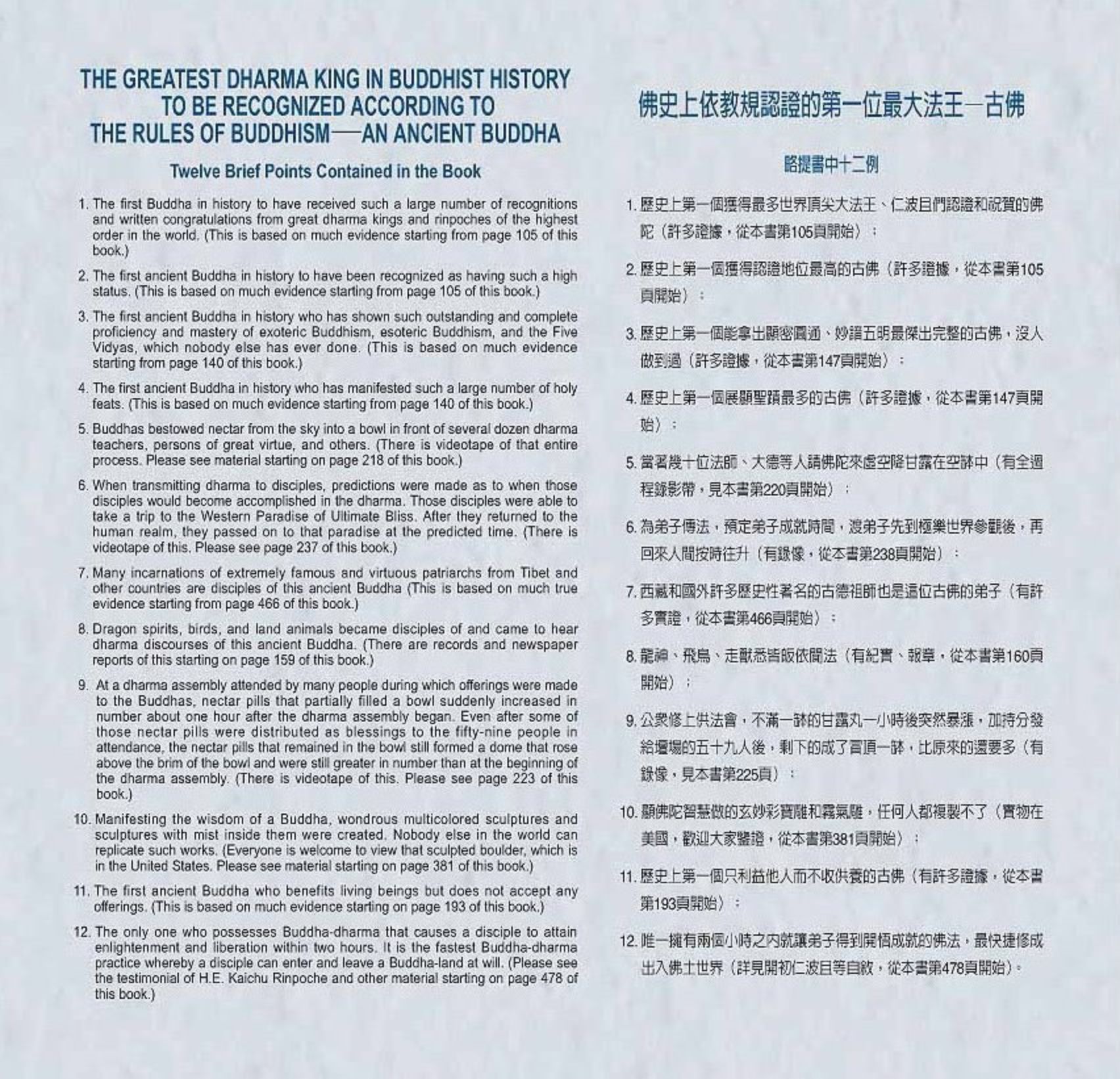 12. The only one who possesses Buddha-dharma that causes a disciple to attain enlightenment and liberation within two hours. it is the fastest Buddha-dharma practice whereby a disciple can enter and leave a Buddha-land at will. (Please see the testimonial of H.E. Kaichu Rinpoche and other material starting on page 478 of this book.)