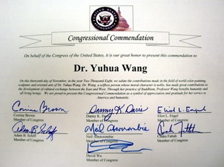 On July 30, 2008, the United States Congressional Record affirmed that “…Dr. Yuhua Wang…has been recognized as a great artist and sculptor.” It was also stated in that Congressional Record that she takes great pleasure in helping others, is a selfless person whose moral character is noble, and has made great contributions to the development of cultural exchange between the East and West. Additionally, Denis G. Antoine, Ph.D., Dean of the Ambassadors of the Western Hemisphere, wrote in a congratulatory letter that the color forms created by Professor Wang are pioneering and without comparison, and her paintings unleash blissful emotions. He also wrote that Professor Wang’s works make people not only think of but also perceive a world of colors that brings a calming a peaceful impact on the mind.