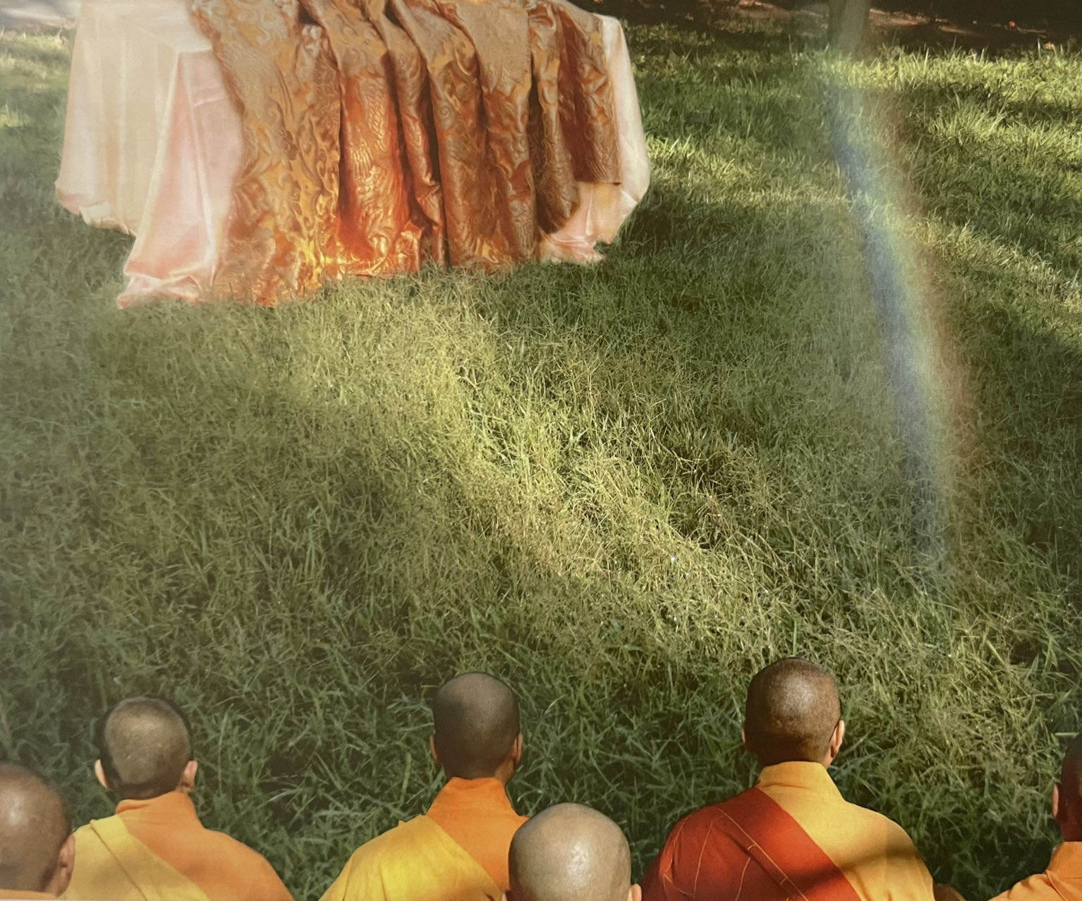 A key point must be mentioned. The multicolored glittering lights on the grass could be regarded as nothing special for it could be viewed as the refraction of sunlight. However, during the ceremony when the Dharma King robe was offered, there was a bright sunny sky without a trace of rain. The multicolored glittering lights unexpectedly coalesced into a cluster of light. In about five seconds, the light transformed into a vertical rainbow and flew into space toward a Buddha-land. That truly manifested the supreme rainbow-transformation Buddha-dharma of the Great Perfection.