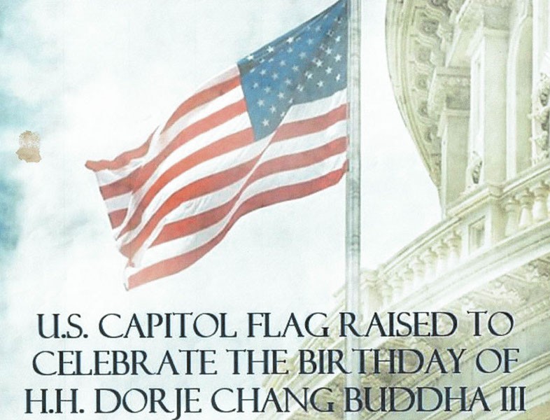 May 15th is the birthday of H.H. Dorje Chang Buddha III. A national flag was raised at Capitol Hill in Washington, D.C. on May 15, 2018, specifically for the birthday of H.H. Dorje Chang Buddha III. The flag-raising document stated, “This flag was flown in honor of H.H. Dorje Chang Buddha III, supreme leader of all Buddhism, on the occasion of his birthday.”