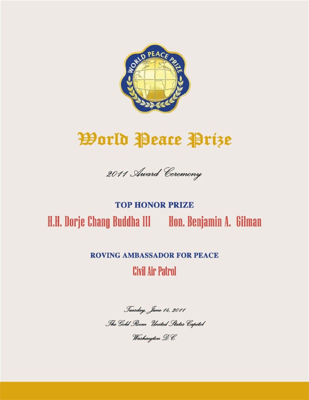 In December 2012, the Senate of the 112th US Congress passed Resolution 614 unanimously to praise the World Peace Corps Mission and the World Peace Prize. In that resolution, the US Senate not only acknowledged that the World Peace Corps Mission is an international organization that operates according to a high core spirit, the World Peace Prize is a prestigious award presented by the World Peace Corps Mission that celebrates individuals who have contributed tremendously to peace and enlightenment of humanity, it also affirmed the World Peace Prize Awarding Council for recognizing H.H. Dorje Chang Buddha III for His devotion to an immensely wide scope of humanitarian activities directed at individuals from different communities throughout the world, as well as acknowledged that H.H. Dorje Chang Buddha III has received numerous awards, including the United States Presidential Gold Award, which the Chairman of the President’s Advisory Commission on Asian Americans and Pacific Islanders presented on behalf of President George W. Bush to H.H. Dorje Chang Buddha III for the outstanding contributions of H.H. Dorje Chang Buddha III to arts, medicine, ethics, Buddhism, spiritual leadership, and United States Society.