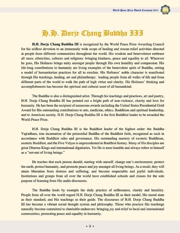 H.H. Dorje Chang Buddha III received the top honor prize of the World Peace Prize in June, 2011. The World Peace Prize is a prestigious award presented by the World Peace Corps Mission, an international Evangelical missionary organization. Since its inception in 1989, the World Peace Prize has been awarded to individuals contributing to the causes of world peace by preventing regional conflicts or world war; by settling the disputes of political, diplomatic and economic matters; or by developing new inventions to minimize threats and confusions within mankind.