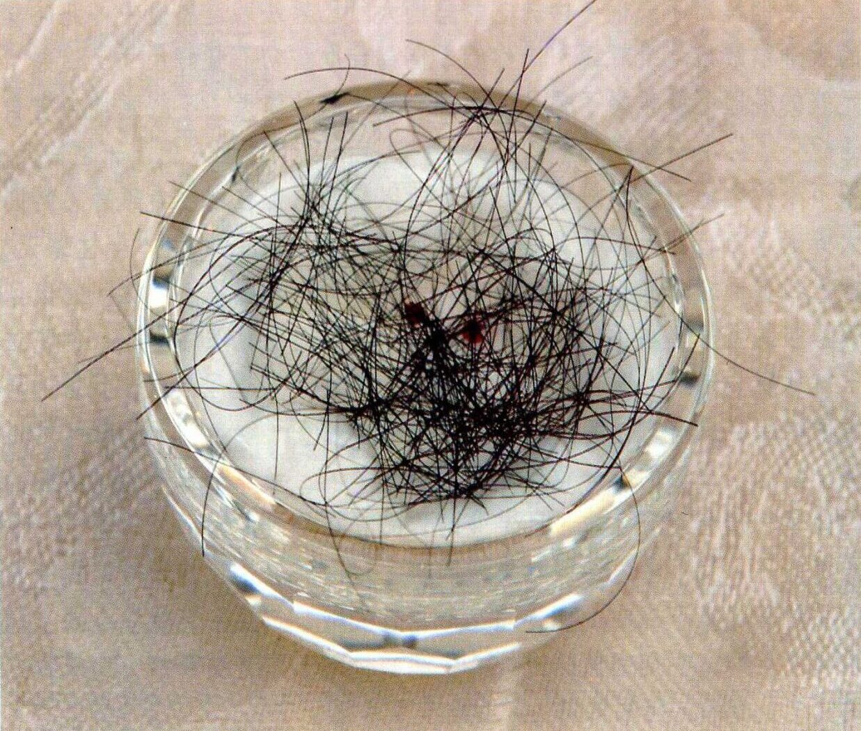 A few months later, I decided to replace the glass bottle with a Venetian crystal bottle. When I opened the glass bottle, I noticed that the originally short hairs were longer than before. Although I was taken aback, I did not think much of it at first. However, the hairs continued to grow, and recently the difference has become unmistakable. Some of the hairs have grown as much as five or six times their original length and now are five or six centimeters long. Some hairs were pinned down on both ends by the stone, and their middle section had grown into a loop. How truly amazing!