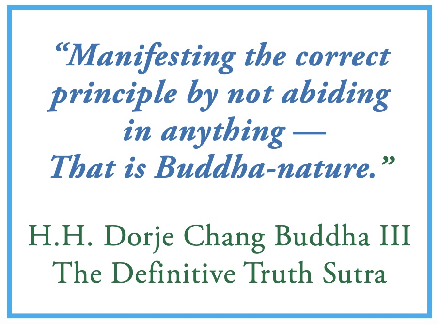 In the Definitive Truth Sutra, H.H. Dorje Chang Buddha III attends a banquet in 2007 hosted by two ancient Buddhas. The conversations that occurred amongst these three Buddhas and another discussion with a wise being were recorded in the Big Blue Treasure Book in Chinese. During the trip to the East Coast taken by His Holiness and several of his more senior disciples mentioned above, He gave a series of discourses on this sutra that are also available in Chinese. Neither these discourses nor the sutra itself have been translated into English for distribution, but preliminary translations are available at our temple in Sanger. This sutra has a very helpful discussion on why we practice the Four Limitless States of Mind and why this conditional dharma is important to train us to eventually have unconditional or ultimate and holy bodhichitta.