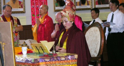 The statue of Dharma Protector Guan Yu was installed at Hua Zang Si on Saturday, July 30, 2005. Chief Rinpoche and head of the temple, Akou Lamo Rinpoche conducted the ceremony and lead the Dharma Assembly outdoors to the pavilion where the Dharma Protector was to reside. The Abbess of the temple, Long Hui Fa Shi, removed the red velvet cloth that covered the statue. Then eight laymen (Ju-shi) carried the large wooden statue using only white silk hardas. Three rinpoches and a dharma teacher guarded the statue with red hardas and escorted the Dharma Protecting Deity to his pavilion. The entire procession with the statue was lead by the person who donated the statue, Ms. Wang from Chengdu, China.