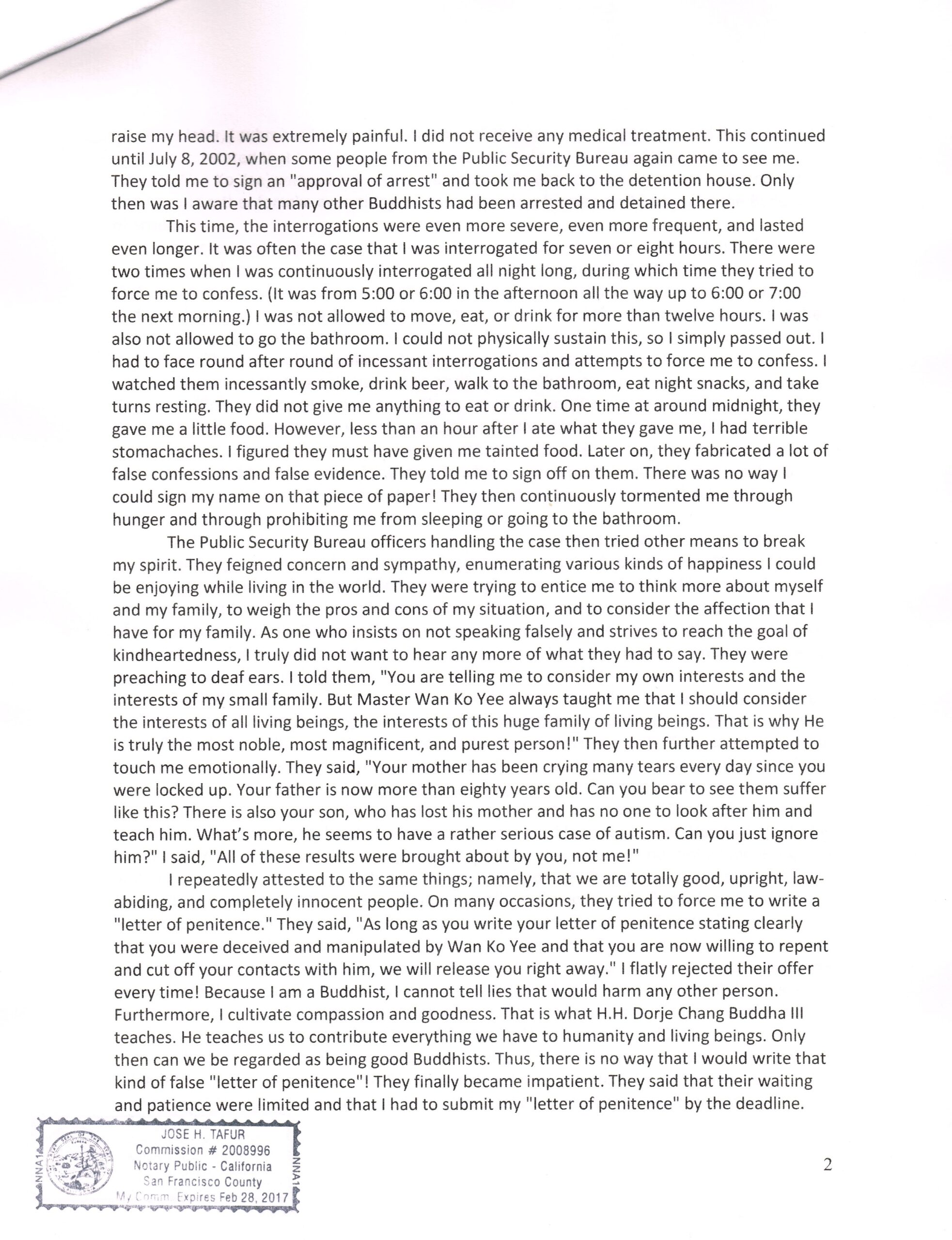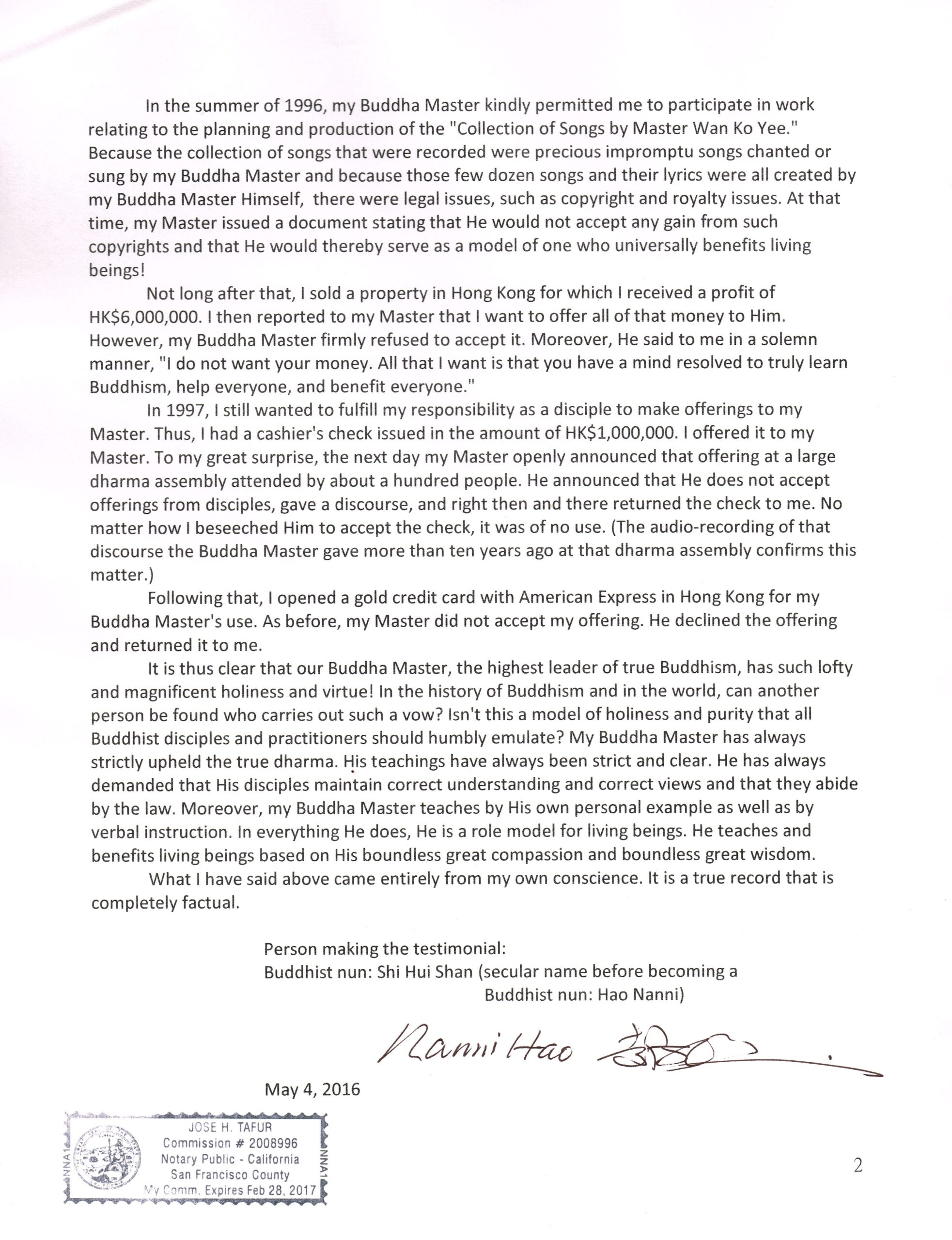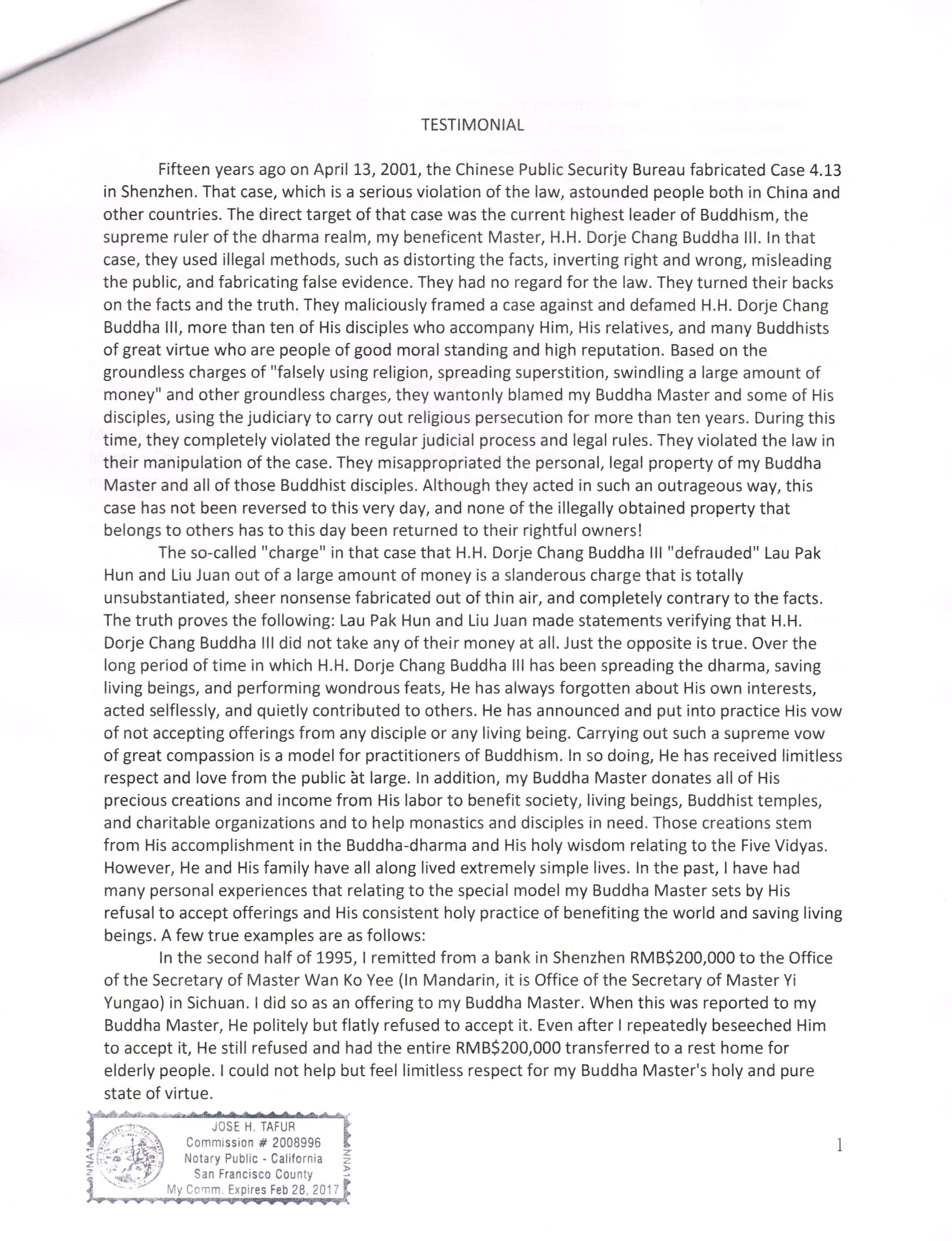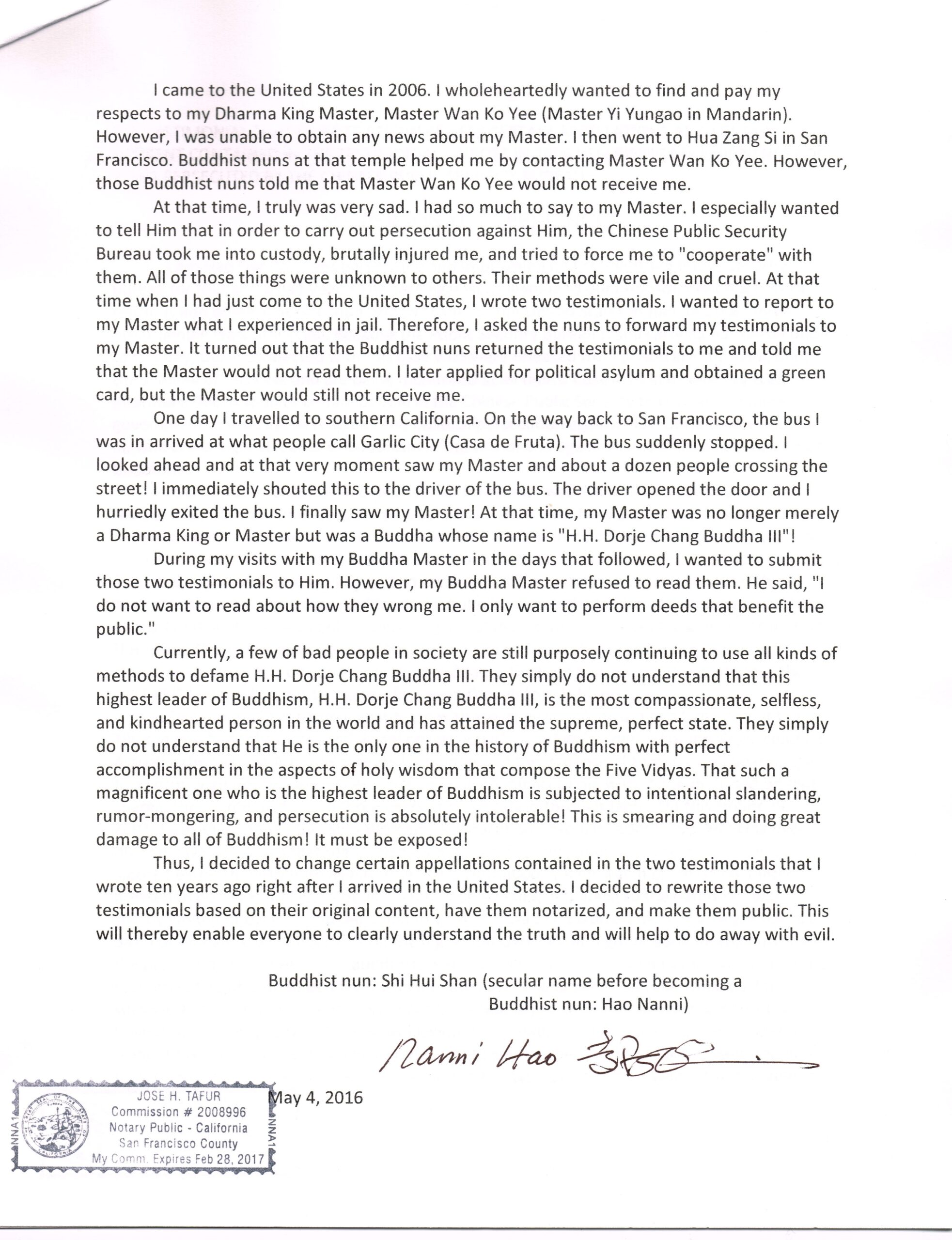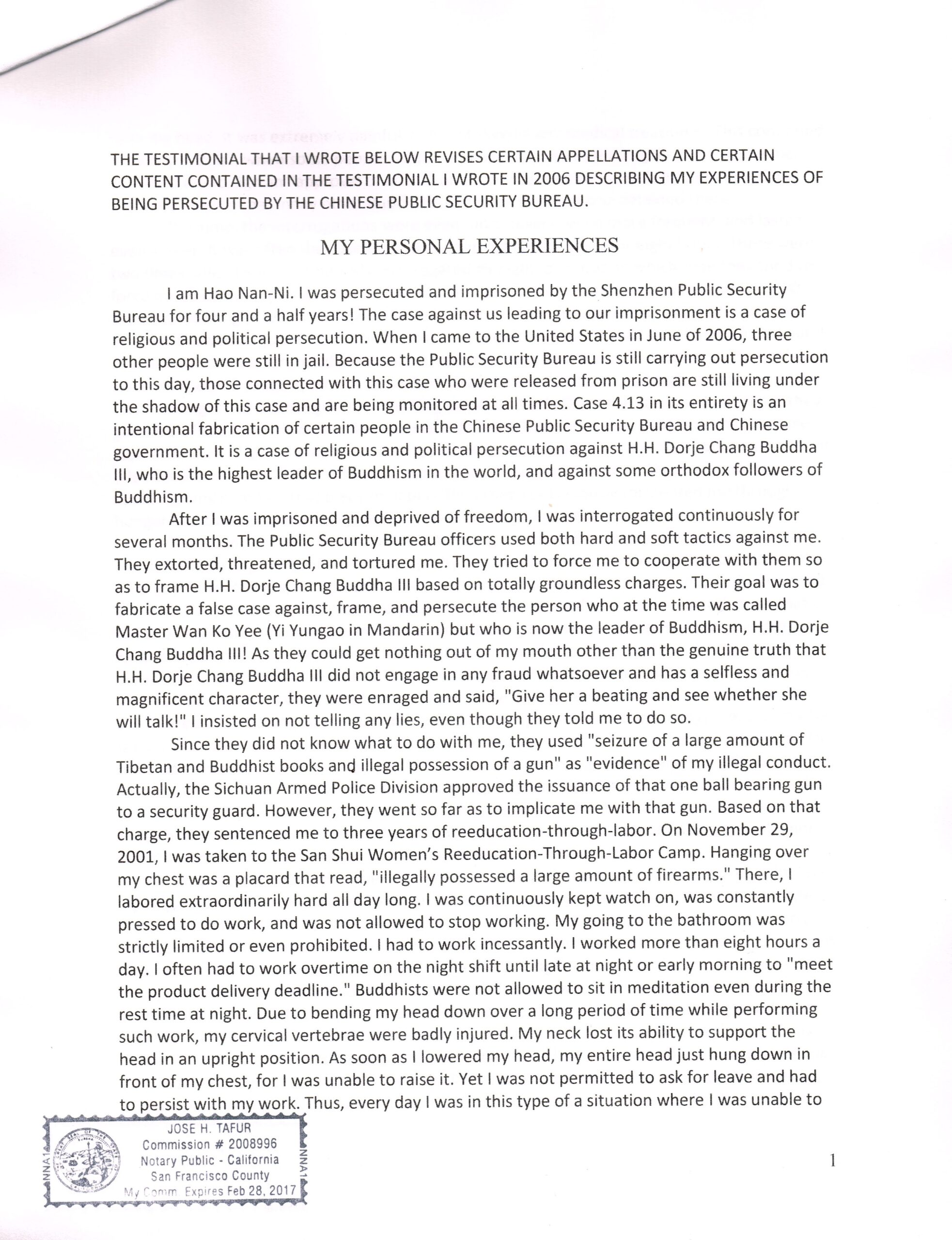 Thus, I decided to change certain appellations contained in the two testimonials that I wrote ten years ago right after I arrived in the United States. I decided to rewrite those two testimonials based on their original content, have them notarized, and make them public. This will thereby enable everyone to clearly understand the truth and will help to do away with evil.