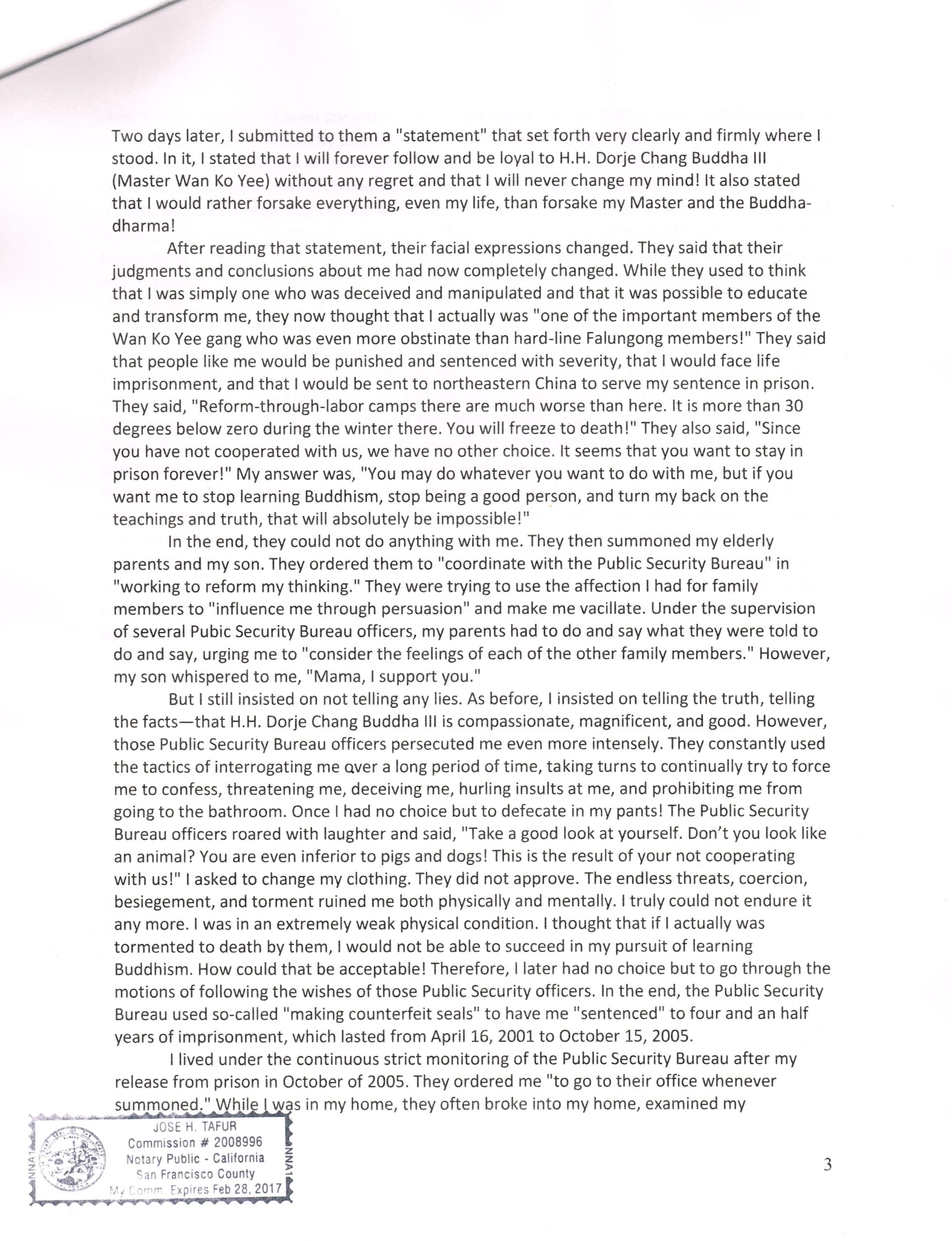 I lived under the continuous strict monitoring of the Public Security Bureau after my release from prison in October of 2005. They ordered me “to go to their office whenever summoned.” While I was in my home, they often broke into my home, examined my identification card, and even sometimes harassed me at 2:00 or 3:00 at night. When I went out of my home, I was followed by unidentified people, who even followed me right up to my door. This has caused me to live in terror all the time. I clearly felt that I could be re-arrested and further persecuted at any time. Having no other choice, I fled to the United States seeking a reliable and safe refuge and for the purpose of returning to my Buddha Master. Thus, I arrived in the United States. I resolved to become a Buddhist nun and find my Buddha Master! In this democratic, safe, and free land of the United States, I did become a Buddhist nun. I am learning and practicing the Buddha-dharma taught by my Buddha Master. I am following the teachings of my Buddha Master to be a truly good, compassionate and sincere person, a person who does not engage in falsehoods and who is without misgivings, a person who benefits society.