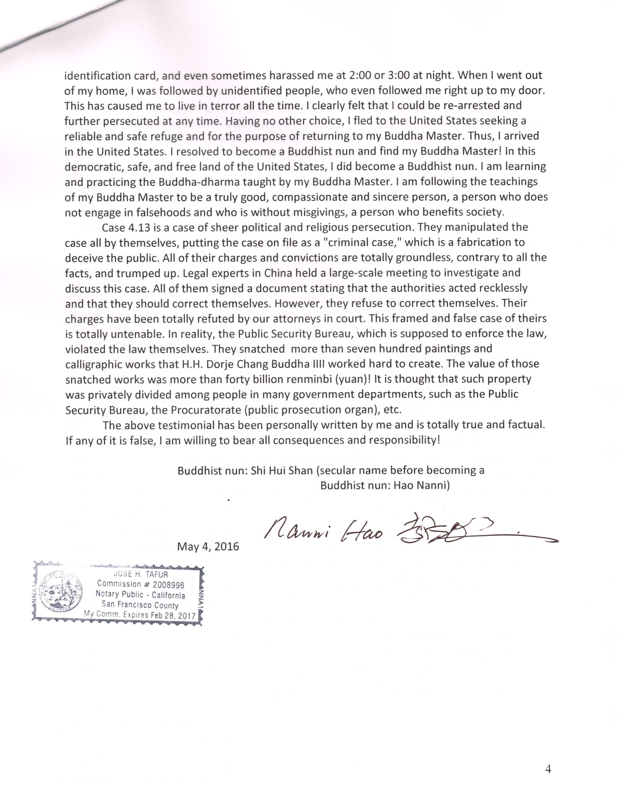 I am Hao Nan-Ni. I was persecuted and imprisoned by the Shenzhen Public Security Bureau for four and a half years! The case against us leading to our imprisonment is a case of religious and political persecution. When I came to the United States in June of 2006, three other people were still in jail. Because the Public Security Bureau is still carrying out persecution to this day, those connected with this case who were released from prison are still living under the shadow of this case and are being monitored at all times. Case 4.13 in its entirety is an intentional fabrication of certain people in the Chinese Public Security Bureau and Chinese government. It is a case of religious and political persecution against H.H. Dorje Chang Buddha III, who is the highest leader of Buddhism in the world, and against some orthodox followers of Buddhism.