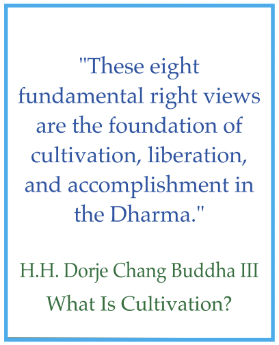 In addition to introducing the Buddha, I also introduced His Dharma by presenting the principles and concepts contained in the treasure book as “What Is Cultivation?” I explained the Eight Fundamental Right Views that were required and the order in which they needed to be practiced. You needed to understand impermanence to have correct motivation; develop a firm belief to have sufficient determination; follow with renunciation that forms the causes of liberation; thus enabling you to take true vows that ensure correct action; with the diligence that guarantees success; take precepts to provide correct direction; practice meditation to achieve wisdom and insight; and finally develop the bodhichitta that enables you to become a holy person or Bodhisattva and eventually a Buddha.