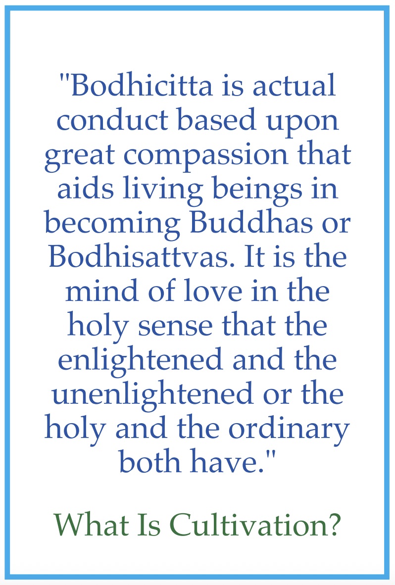 In addition to introducing the Buddha, I also introduced His Dharma by presenting the principles and concepts contained in the treasure book as “What Is Cultivation?” I explained the Eight Fundamental Right Views that were required and the order in which they needed to be practiced. You needed to understand impermanence to have correct motivation; develop a firm belief to have sufficient determination; follow with renunciation that forms the causes of liberation; thus enabling you to take true vows that ensure correct action; with the diligence that guarantees success; take precepts to provide correct direction; practice meditation to achieve wisdom and insight; and finally develop the bodhichitta that enables you to become a holy person or Bodhisattva and eventually a Buddha.