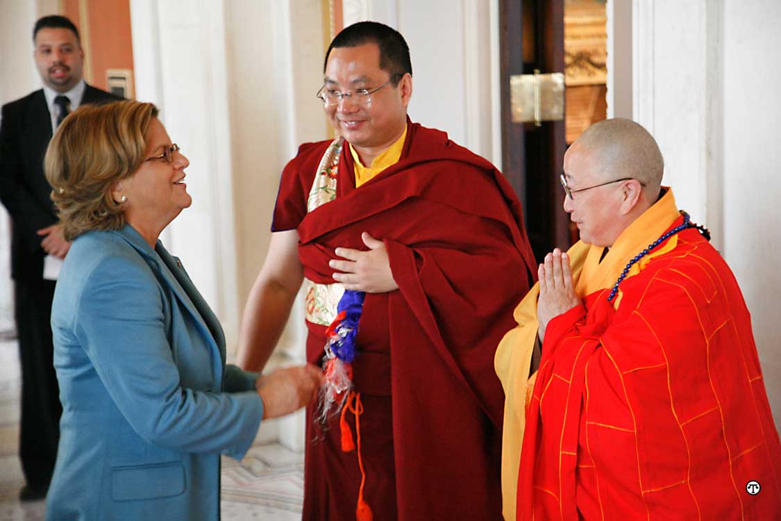FIGURE 22: Congresswoman Ileana Ros-Lehtinen, who spoke at the Library of Congress cere mony, talks to Disciple Denma Tsemang II Longzhi Tanpe Nyima Rinpoche, Washington, D.C. this was such an auspicious start for our effort to let America know that we have a very great holy one living in our midst.