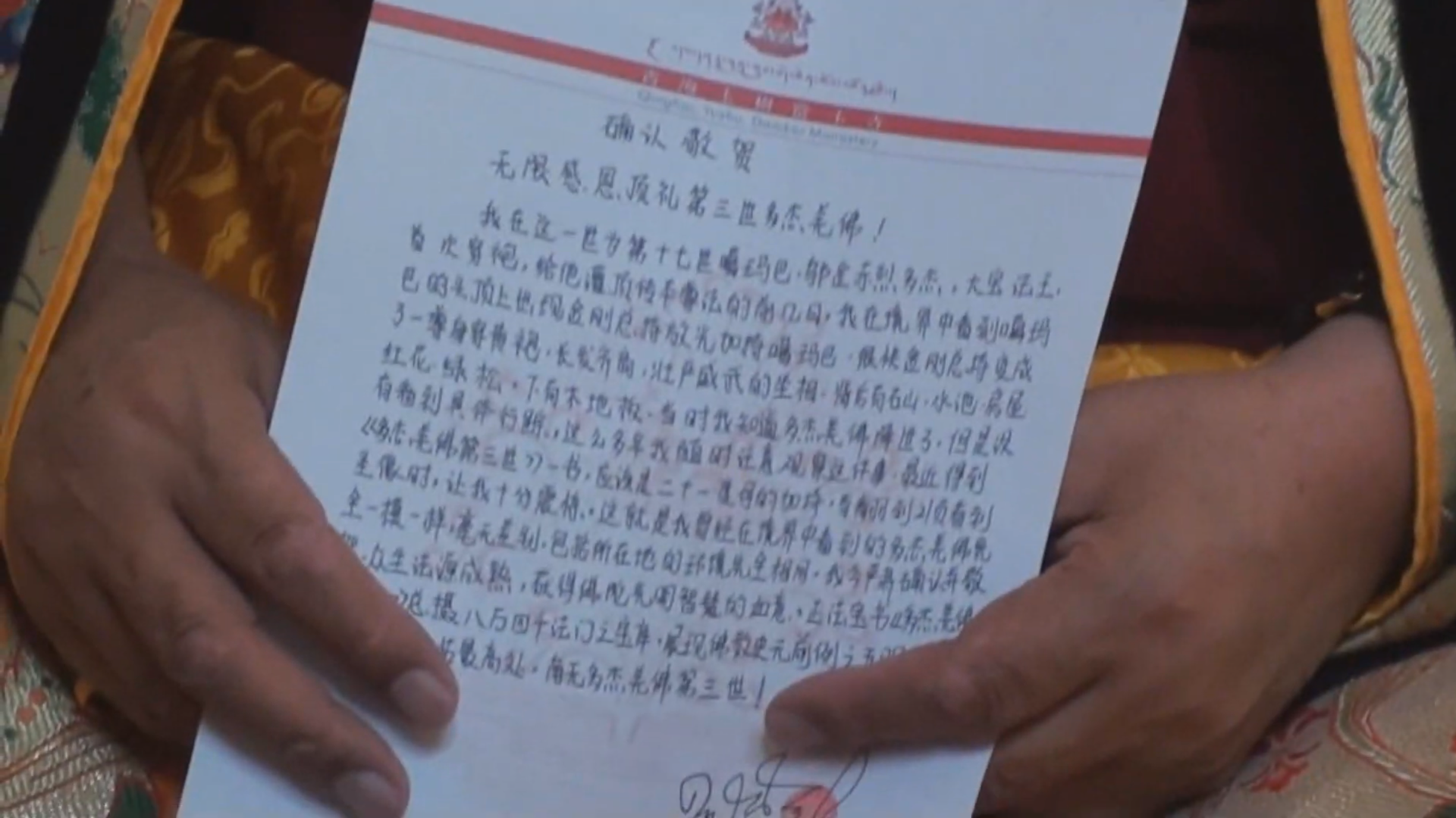 H.H. Dharma King Dumu Quji was conferred the title of “Buddha-Dharma National Master” by an emperor in the Ming Dynasty. The meaning of “Quji” is Dharma King. H.H. Dharma King Gongbao Dumu Quji XVIII is the Vajra Master of H.H. the 17th Karmapa Great Jewel Dharma King. He performed the yidam dharma initiation for H.H. the 17th Karmapa Great Jewel Dharma King. He is the only one of great holiness and virtue who cleansed through a ritual bathing H.H. the 17th Karmapa and formally put the Great Jewel Dharma King robes onto H.H. the 17th Karmapa. He did so at the respectful request of H.E. Tai Situ Rinpoche, who is one of the four great Dharma Princes. During the time H.H. Dharma King Gongbao Dumu Quji XVIII performed initiations for the Karmapa, he saw in a supernatural state the ancient, primordial Buddha—Dorje Chang Buddha—bless the Karmapa. That ancient Buddha manifested as H.H. Dorje Chang Buddha III. H.H. Dharma King Gongbao Dumu Quji XVIII wrote the following about this real experience: “H.H. Dorje Chang Buddha III is the highest refuge countless living beings can rely upon to attain liberation. I prostrate to H.H. Dorje Chang Buddha III.”