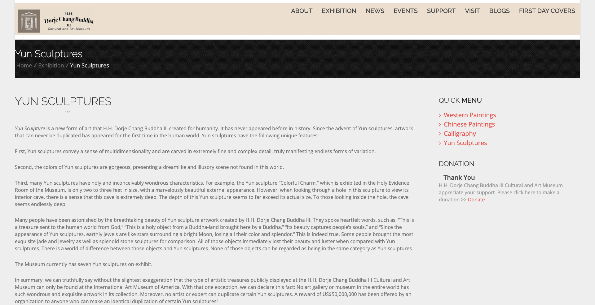 In summary, we can truthfully say without the slightest exaggeration that the type of artistic treasures publicly displayed at the H.H. Dorje Chang Buddha III Cultural and Art Museum can only be found at the International Art Museum of America. With that one exception, we can declare this fact: No art gallery or museum in the entire world has such wondrous and exquisite artwork in its collection. Moreover, no artist or expert can duplicate certain Yun sculptures. A reward of US$50,000,000 has been offered by an organization to anyone who can make an identical duplication of certain Yun sculptures!