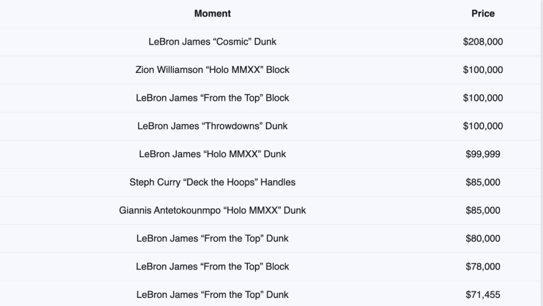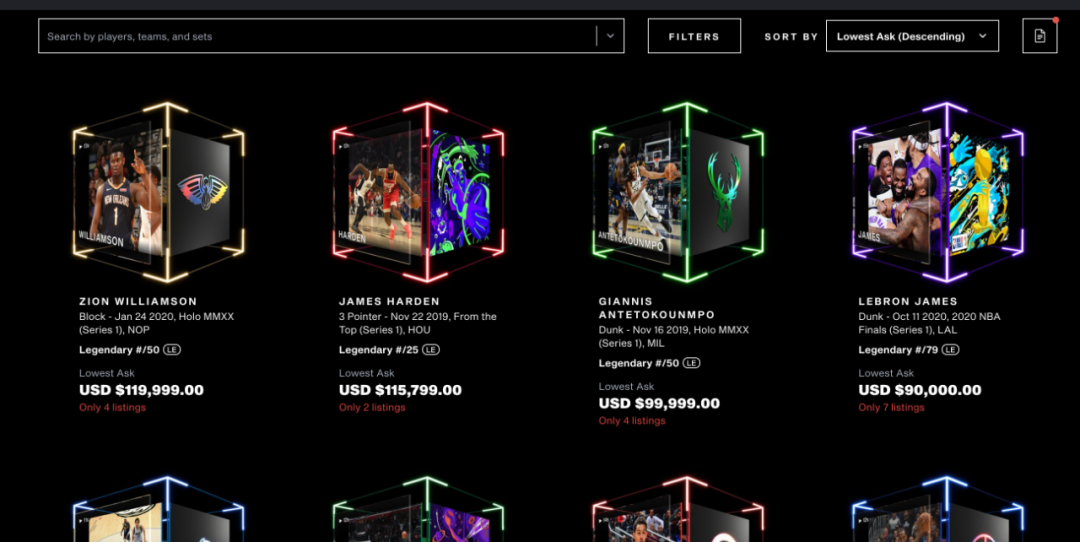 您一定好奇這些高光時刻Moments到底長個什麼模樣,能被粉絲團和炒作大軍如此追捧吧?每個Moment的內容主要都是明星球員幾秒鐘的瀟灑動作,比如一個漂亮的灌籃、三分、傳球、配合等等。區塊鏈(blockchain)的特質確保了每個Moment的唯一性、正版性和不可複制性。而這款遊戲為了保證Moment卡片的稀缺性,為某些大牌球員的Moment限定了發行數量,再用動畫特效給它們加上一圈小“光環”,搞定!出品幾十美刀的Moment,華麗轉幾次身,價格輕而易舉被哄抬到成千上萬。