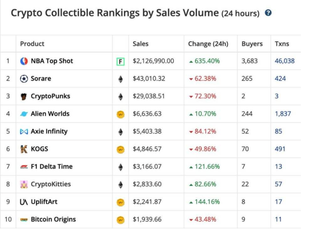 如果您還是無法想像這些互聯網產品能有多搶手,那就一起來看一組業內統計。據CryptoSlam公佈的數據顯示,NBA Top Shot的熱度目前在區塊鏈遊戲中一騎絕塵,今年一月份某日僅24小時內該遊戲交易量超過600萬美元,這一數據是排名次席的Sorare的近50倍,更是遠高於榜單排名2-30名遊戲的單日成交量之和!